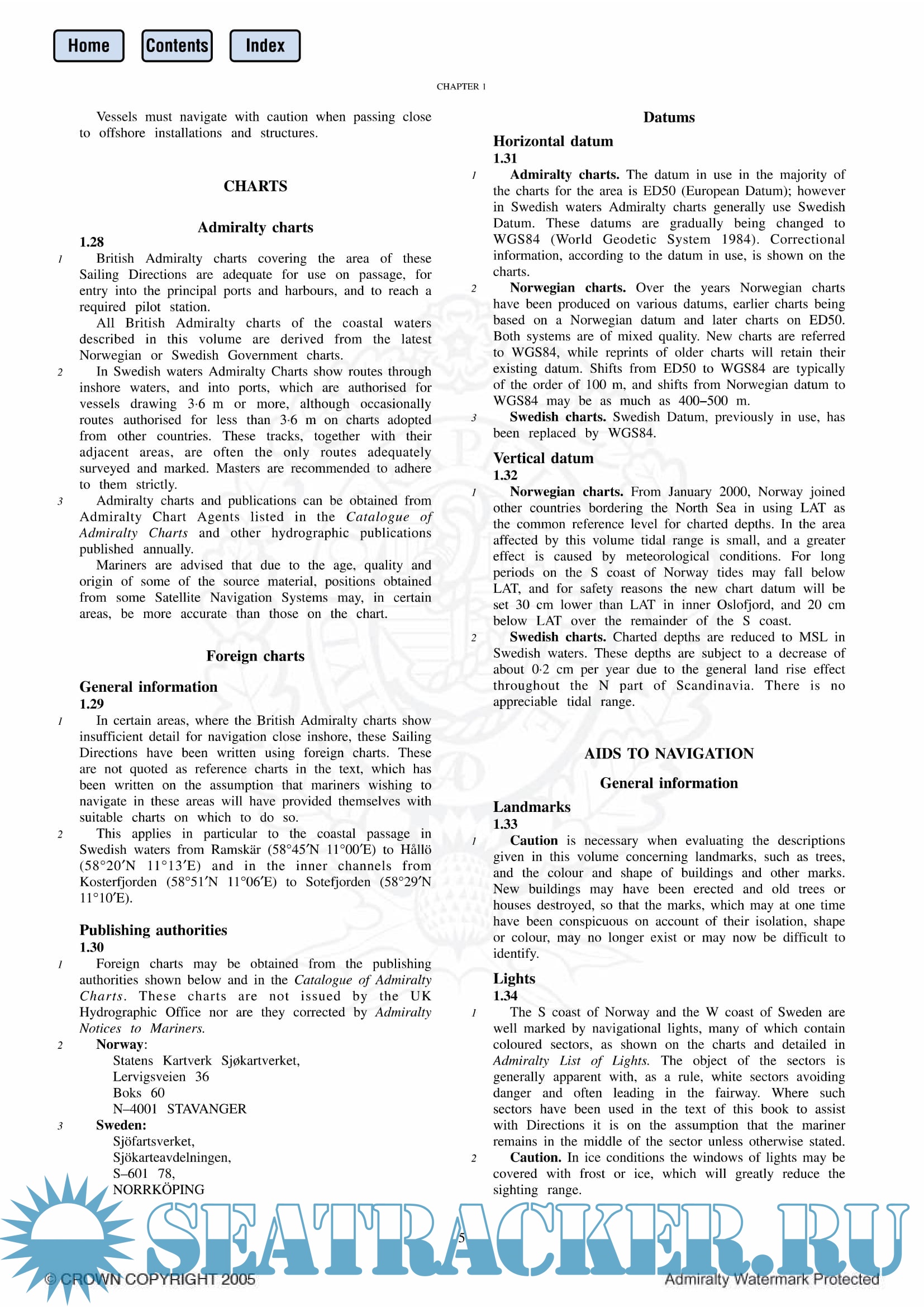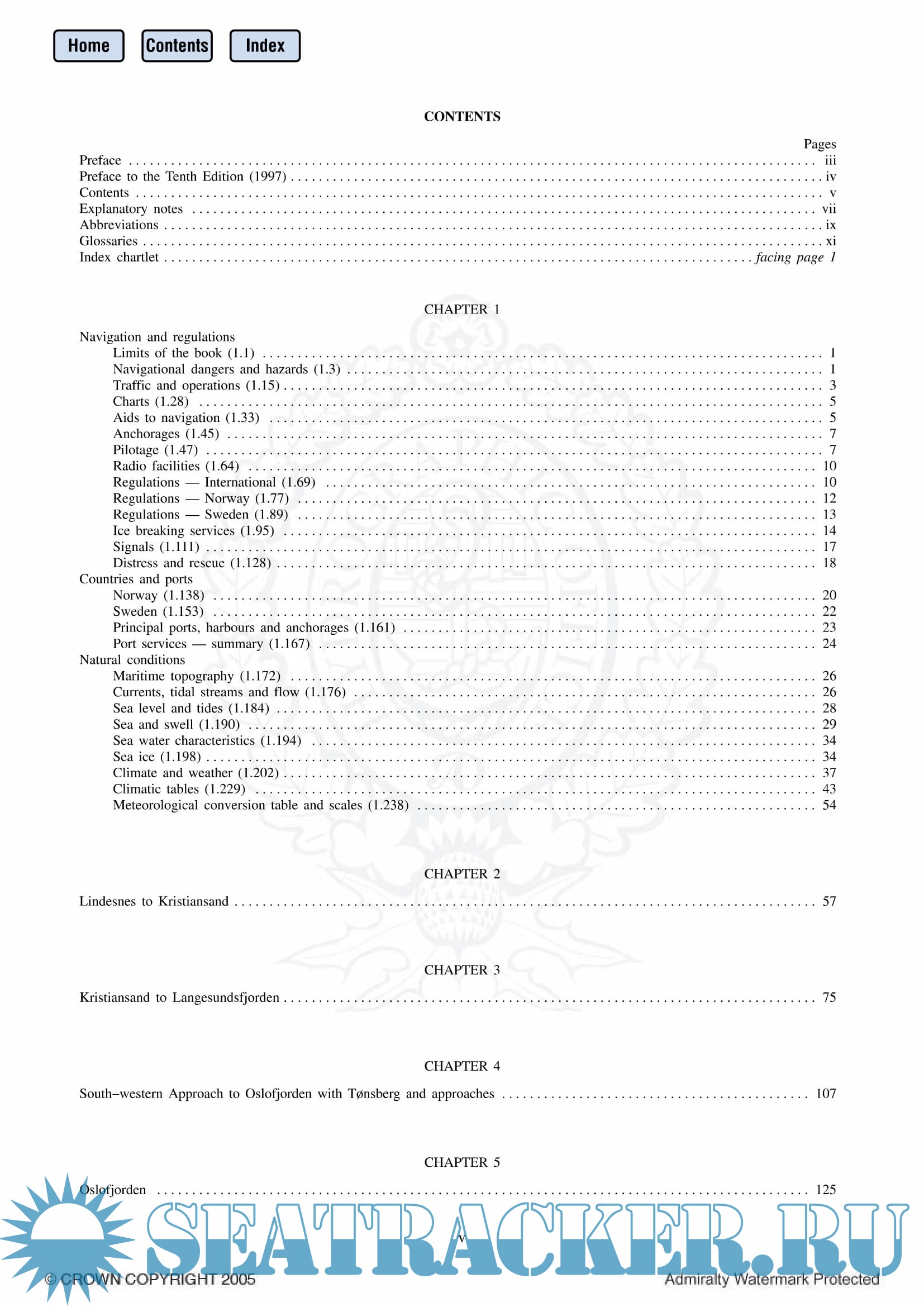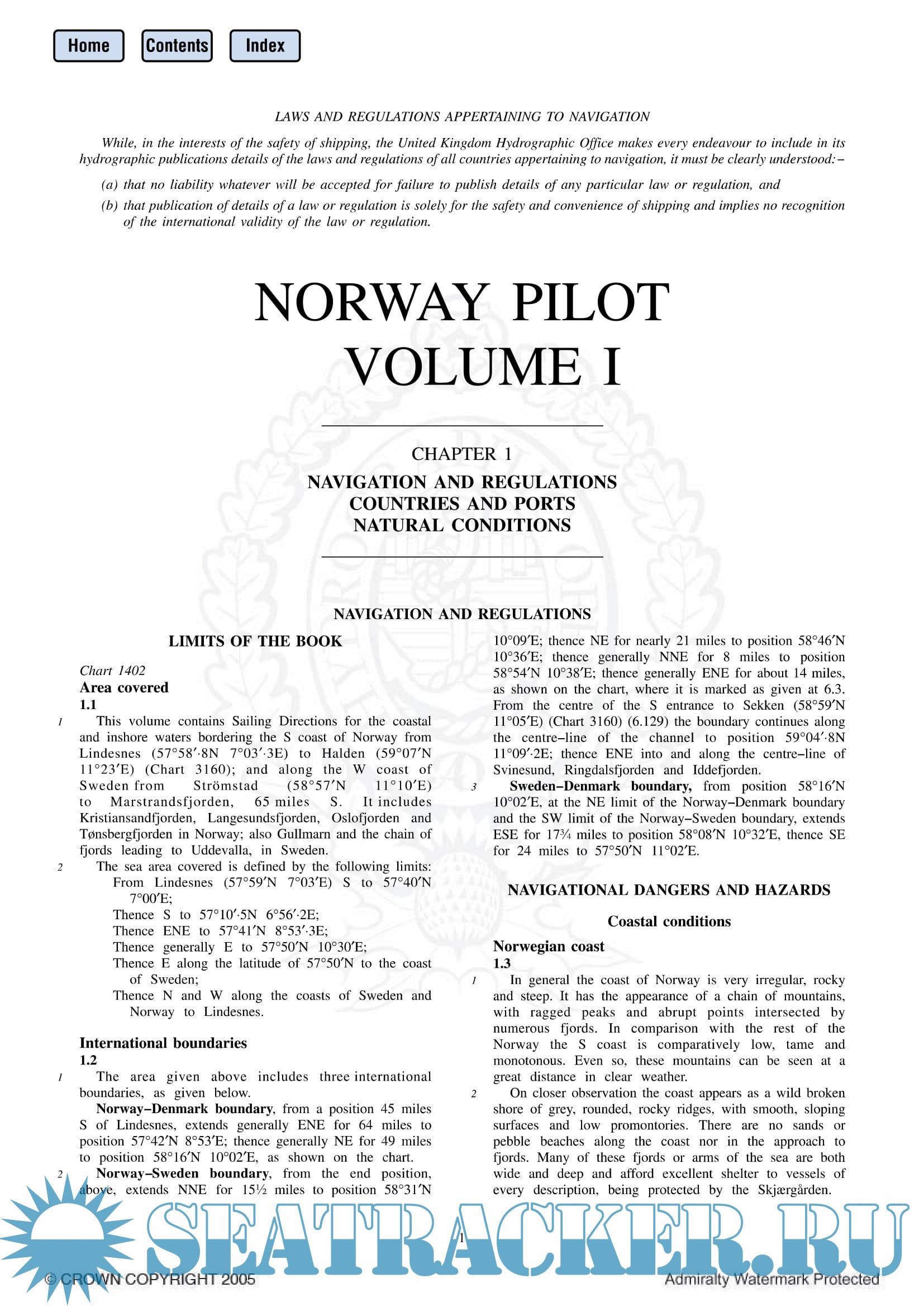 Year: 2005 Language: english Author: The United Kingdom Hydrograpics Office Genre: Reference book Publisher: UKHO Edition: 13 Format: PDF Quality: eBook Pages count: 259 Description: Norway Pilot Vol. I (NP 56) in the British Admiralty Sailing Directions series. It covers the south coast of Norway eastward from Lindesnes, and the west coast of Sweden southward to Marstrandsfjorden.