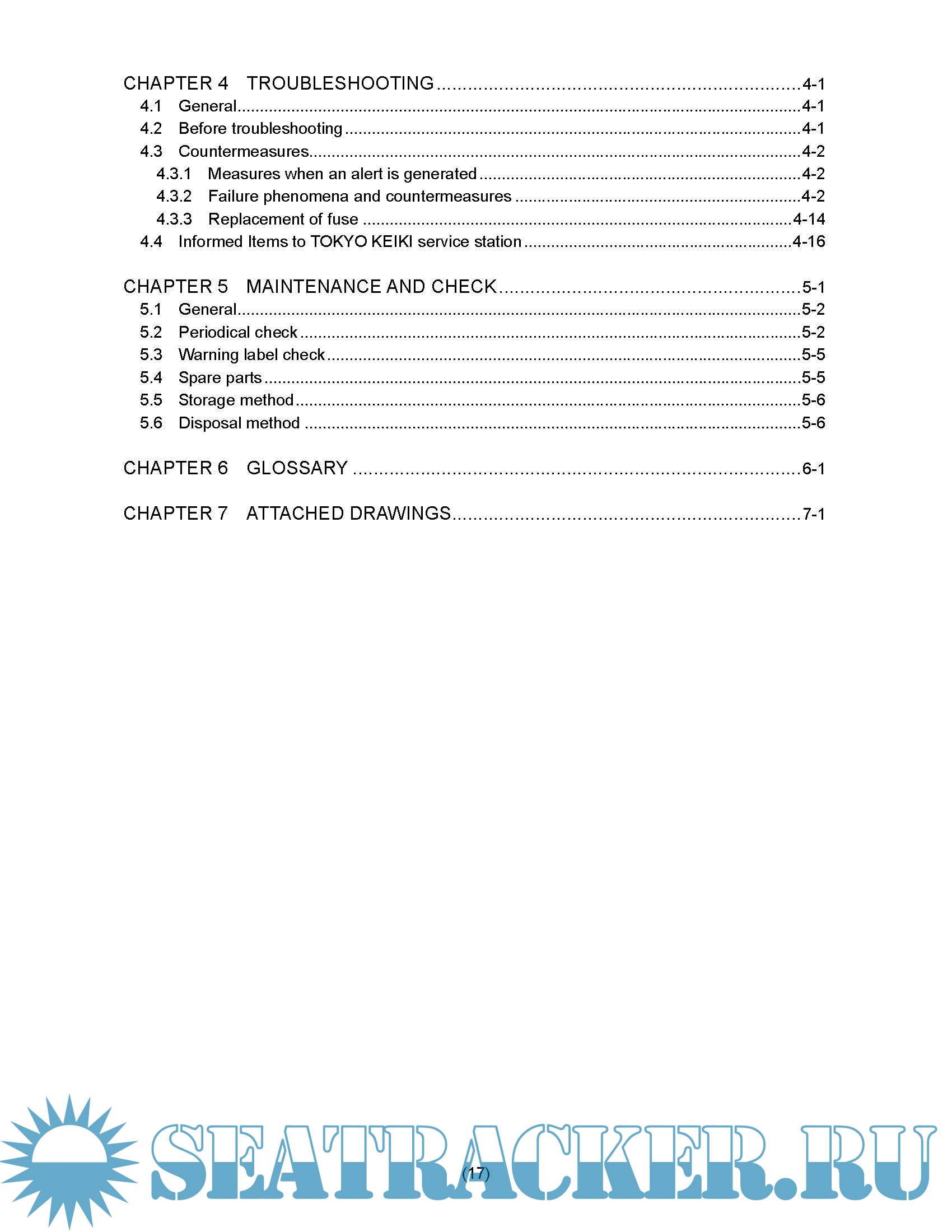 Year: 2018 Language: english Author: TOKYO KEIKY Genre: Manual Publisher: TOKYO KEIKY Edition: 2018 Format: PDF Quality: eBook Pages count: 105 Description: This manual provides safety-related precautions and outline of this system, and includes detailed information on specifications, construction, operation, troubleshooting and countermeasures, etc.
