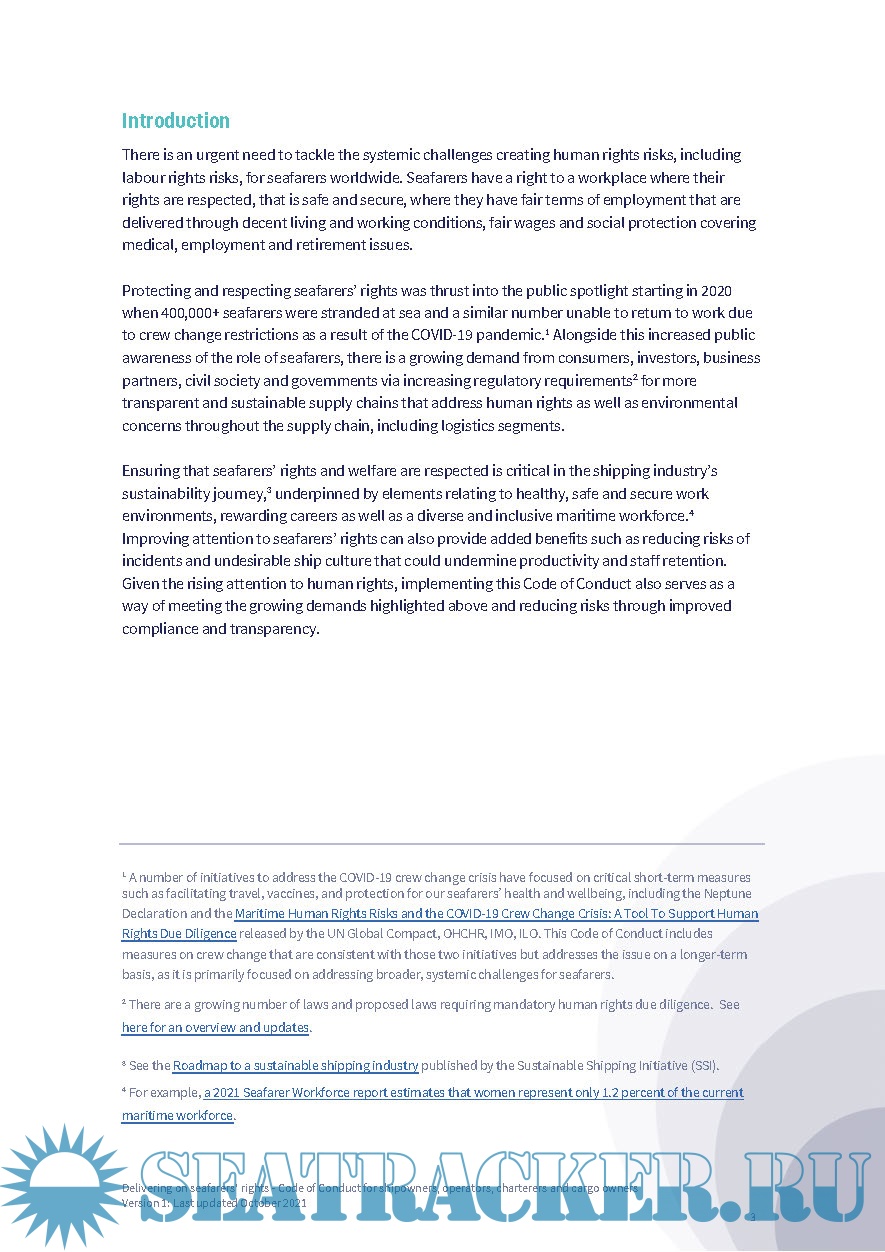 Year: 2021 Language: english Author: IHRB Format: PDF Quality: eBook Pages count: 16 Description: This Code of Conduct is the result of ongoing work carried out by the Sustainable Shipping Initiative’s (SSI) Delivering on seafarers’ rights working group, in partnership with the Institute for Human Rights and Business (IHRB) and in collaboration with the Rafto Foundation for Human Rights. It brings together shipowners, ship operators, charterers and cargo owners to drive positive change in the industry, through individual and collective action and increased transparency to deliver on seafarers’ rights. Version 1: Last updated October 2021