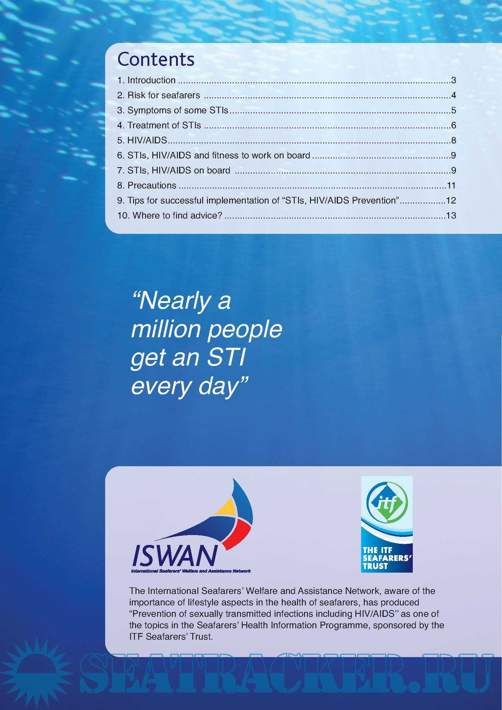 This guide encourages seafarers to look after their own sexual health. It provides information on the symptoms and treatment of common STIs, as well as HIV/AIDS, and the precautions seafarers should take. Seafarers should protect themselves against sexually transmitted infections when travelling.