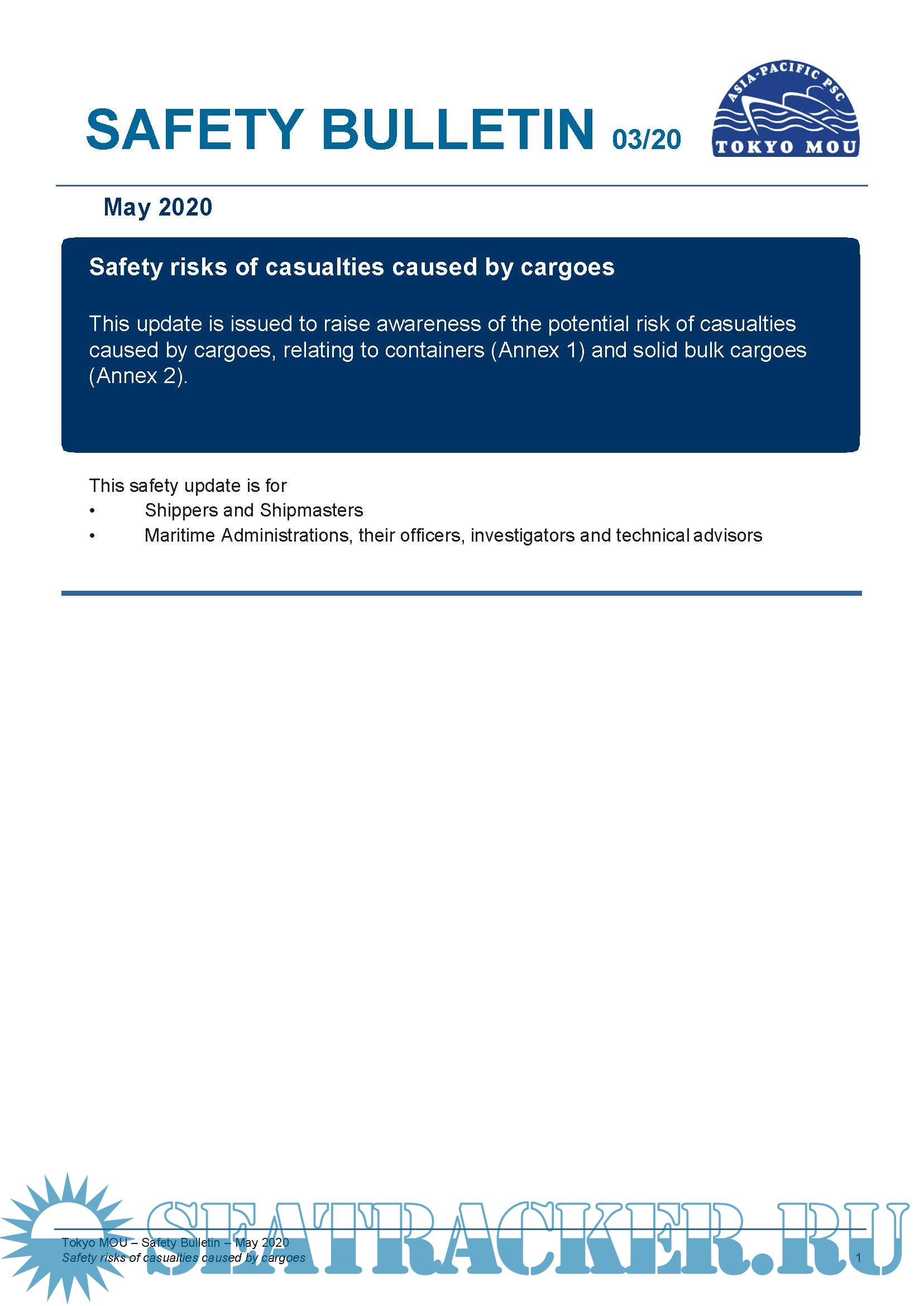 Tokyo MOU Safety Bulletin is to bring the alert and attention to the interested parties of the industry in relation to the relevant safety issues/risks.