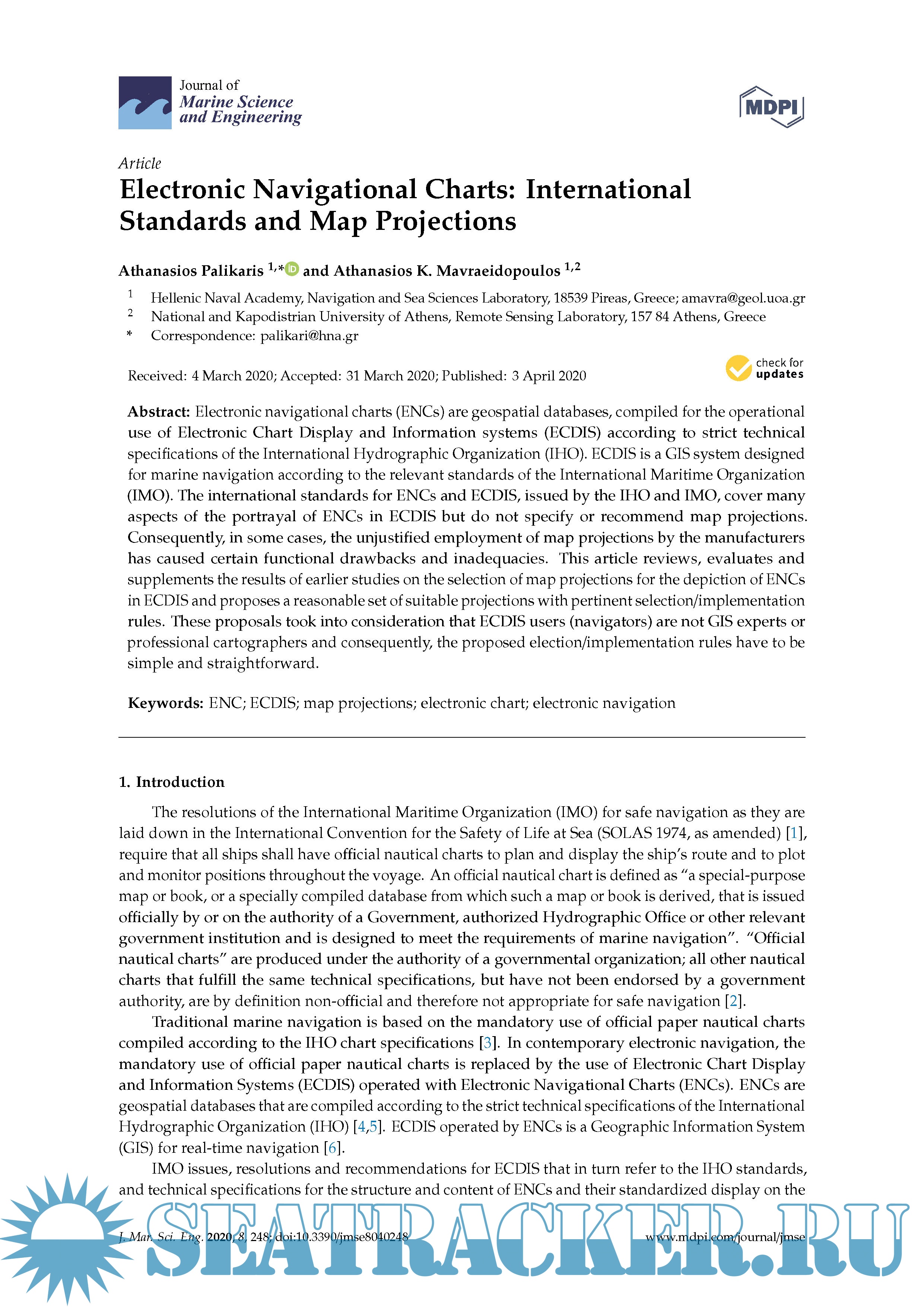 Year: 2020 Language: english Author: Athanasios Palikaris Format: PDF Quality: eBook Pages count: 19 Description: The aim of this study is: - The detection and presentation of the consequences of the lack of international standards on the employment of map projections in ECDIS. - The identification of a reasonable set of suitable map projections for the display of ENCs in ECDIS. - The proposal of simple selection/implementation rules, that can be easily used by both ECDIS manufacturers and users. The proposed in this study rules for the selection of suitable map projections in ECDIS, employ only three candidate map projections. These rules can be easily implemented by both manufactures and users (navigatos). The validity of the proposed map projections has been verified by the conducted comparative evaluation and numerical tests based on specific criteria and parameters for he requiremebts of all navigational usages of ENCs.