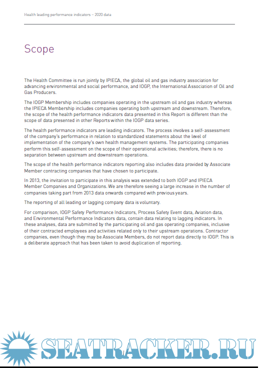 The IOGP Membership includes companies operating in the upstream oil and gas industry whereas the IPIECA Membership includes companies operating both upstream and downstream. Therefore, the scope of the health performance indicators data presented in this Report is different than the scope of data presented in other Reports within the IOGP data series.