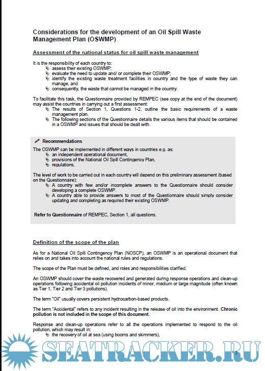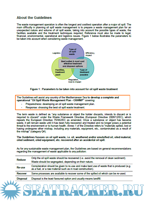 Year: 2011 Language: english Author: REMPEC Genre: Guide Format: PDF Quality: eBook Pages count: 144 Description: Due to the difficulties associated with the management of the waste, after a spill, from its removal, transport, treatment, to the final disposal, waste management is considered as being a key element of the contingency plan. It is thus a fundamental requirement that waste management is incorporated in the response strategy from the beginning of the response operation to ensure a successful response, avoid secondary contamination and minimize costs.