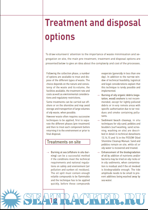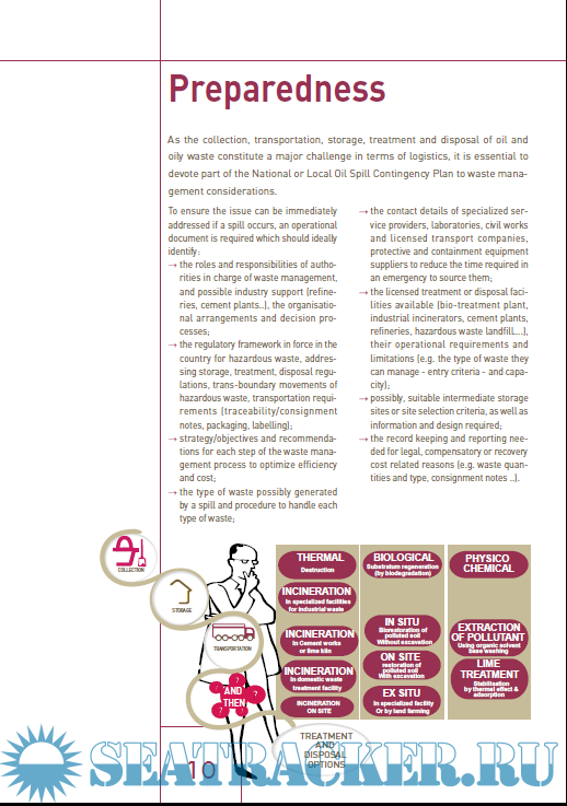 Year: 2016 Language: english Author: POSOW Genre: Manual Format: PDF Quality: eBook Pages count: 46 Description: Waste management starts from the removal of oil and oily debris on the shoreline or at sea, and includes temporary storage, transport, treatment, and final disposal in a safe and secure manner taking into consideration the hazardousness of oil. Due to the difficulties associated with all these operations, waste management is considered as being a key element of the oil spill response. The lessons learnt from past incidents have shown that a failure in waste management logistics can be a bottleneck that hinders the efficiency of the whole response process.