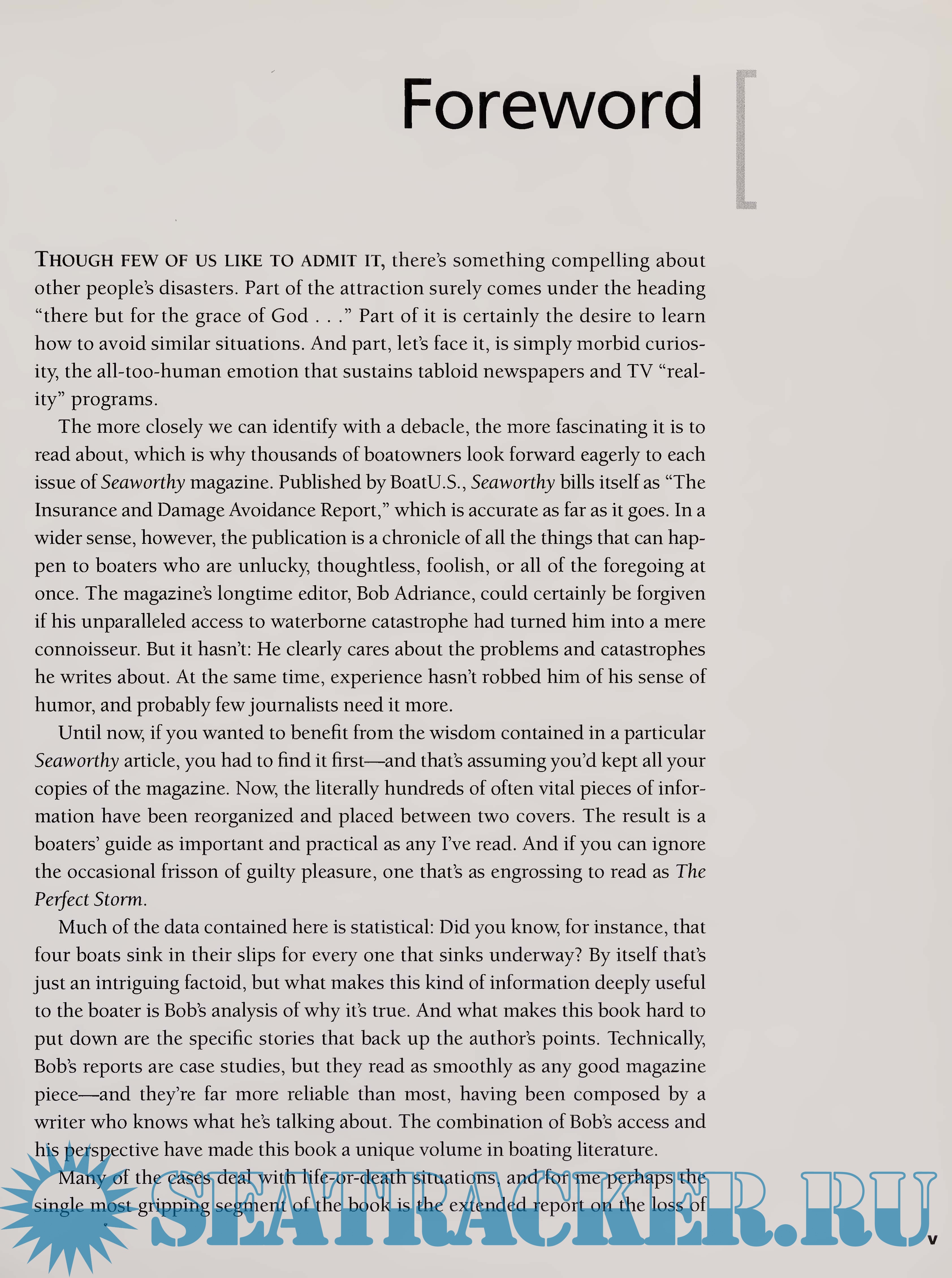 Year: 2005 Language: english Author: Robert A. Adriance Genre: Handbook Publisher: International Marine Edition: First ISBN: 0-07-145327-X Format: PDF & EPUB Quality: Scanned pages Pages count: 294 Description: You're safest on the water when you and your boat are seaworthy BoatU.S. provides marine insurance coverage to 250,000 American powerboaters and sailors, which makes its collection of claims reports one of the world’s largest archives of boating accidents. For more than 20 years, as writer and editor of BoatU.S.’s quarterly publication Seaworthy, Bob Adriance has sifted and analyzed this rich trove to discover and highlight the profound lessons it contains. Here is the ultimate boater’s guide to preventing, responding to, and surviving accidents under power or sail, including hurricane damage, lightning strikes, collisions, fires, groundings, sinkings, crew overboard, dismastings, and more. Experience may be the best teacher, but the lessons are a lot less painful when the experience is someone else’s. Here is a unique opportunity to use other skippers’ misfortunes to make your own boat and seamanship safer. “A boaters’ guide as important and practical as any I’ve read. And if you can ignore the occasional frisson of guilty pleasure, one that’s as engrossing to read as The Perfect Storm.”–Tony Gibbs, yachting writer, editor, and novelist “Hair-raising disasters, hard facts, and helpful advice; Seaworthy is a compendium of no-nonsense information on avoiding problems that only a marine insurer could provide. Invaluable for the boater, builder, designer, and surveyor.”–Dave Gerr, director, Westlawn Institute of Tecnology; author of The Nature of Boats and The Elements of Boat Strength Additional info: Robert A. Adriance has edited Seaworthy magazine and written and compiled BoatU.S.'s accident reports for more than 20 years. He is also editor of BoatU.S.'s Technical Information Exchange for Marine Professionals, the co-editor of the U.S. Coast Guard Auxiliary's Beacon magazine, and assistant vice president, technical services, for BoatU.S.'s Marine Insurance Division.