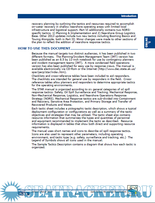 Description: The Spill Tactics for Alaska Responders (STAR) manual provides a standardized oil spill response tactics manual specific to the State of Alaska. The manual is intended to be a standard tactical reference for oil spill planning and response activities in Alaska. It is available for use by the spill response community, including federal, state, local, industry, and spill response organizations throughout Alaska.