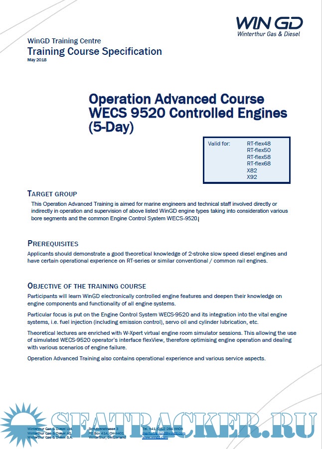 Description: This Operation Advanced Training (5 Days) is aimed for marine engineers and technical staff involved directly or indirectly in operation and supervision of above listed WinGD engine types taking into consideration various bore segments and the common Engine Control System WECS-9520.