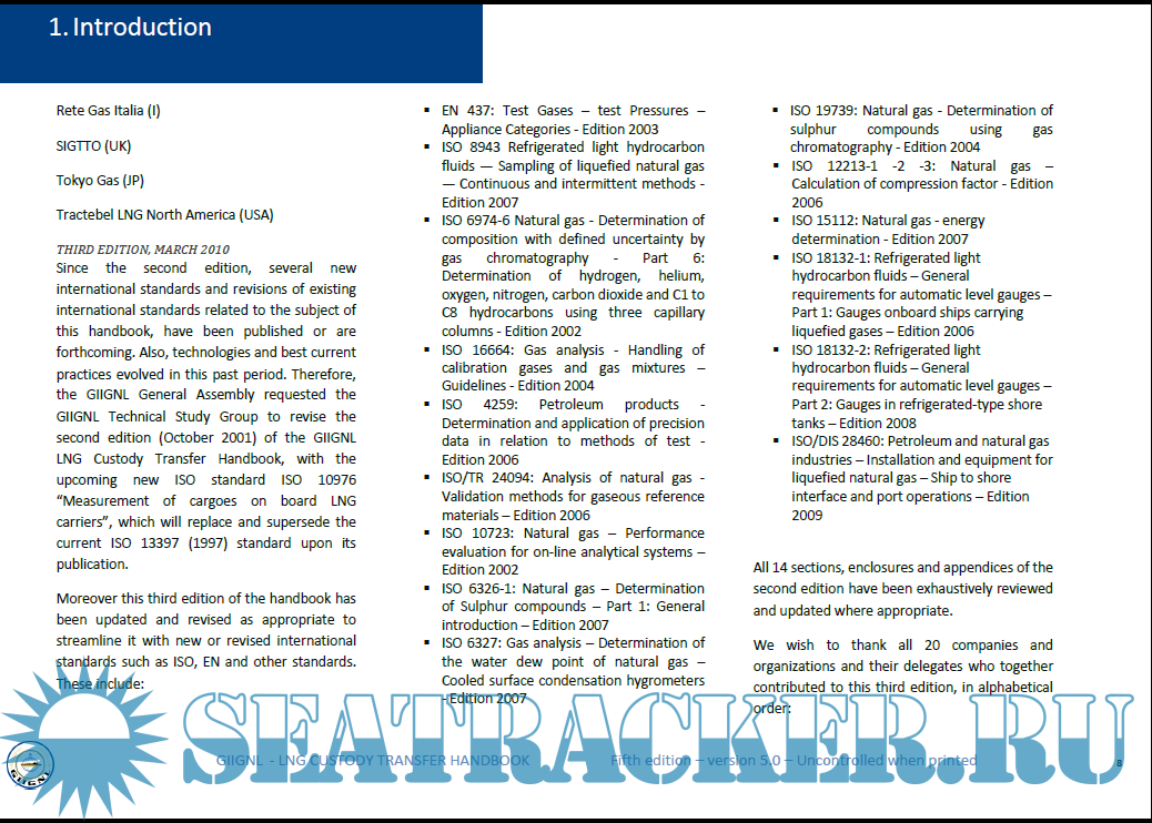 Year: 2017 Language: english Author: GIIGNL Genre: Manual Format: PDF Quality: eBook Pages count: 179 Description: This fifth (2017) edition of the GIIGNL LNG Custody Transfer Handbook reflects GIIGNL’s understanding of best current practice at the time of publication.The purpose of this handbook is to serve as a reference manual to assist readers to understand the procedures and equipment available to and used by the members of GIIGNL to determine the energy quantity of LNG transferred between LNG ships and LNG terminals. It is neither a standard nor a specification.