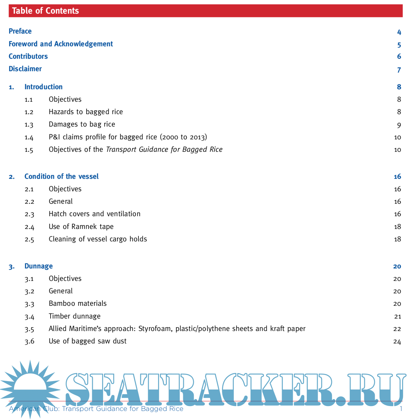 Year: 201? Language: english Author: Mssrs. Jeroen de Haas et alli Genre: Guide Publisher: American Club Format: PDF Quality: eBook Pages count: 73 Description: Rice is the staple food for many societies around the world. Of the nearly 475 million metric tons of rice produced globally in 2013, the largest producers were China (with 30% of the total) and India (with 22%)1. However, most of the rice produced in these countries is consumed domestically. In contrast, the largest exporters of rice since 2008 have been Thailand (with about 25% of the total), Vietnam (with about 20%), India (about 16%) and the United States (at just under 10%)2. Overall, it is estimated that only 5% to 6% of global rice production is transported internationally. Nevertheless, even this figure represents a significant volume of global trade. Traditionally, rice was carried as break-bulk cargo onboard general cargo vessels. The techniques used in the carriage of such cargo included the use of permanent wooden dunnage within which spaces were designed to ensure proper ventilation. More recently, the shipment of bulk rice is by way of containerized cargo. As global demand for food has risen, now most rice shipments are made in bagged form onboard traditional bulk carriers. Therefore, the primary focus of this guidance is upon the carriage of bagged rice in bulk carriers. Cargo claims have comprised, on average, about 25% of The American Club’s total exposure. Within the cargo claims category, bagged rice claims in regions such as West Africa have been the most prevalent type of cargo claims encountered by The American Club’s Membership. While The American Club has pioneered innovative actions such as the use of the anti-suit injunction mechanism to significantly reduce and thwart the ability of cargo interests to present fictitious and exaggerated claims involving bagged rice and other cargoes, preventative measures are still the most useful tools to prevent against these potential exposures. Transport Guidance for Bagged Rice draws upon the knowledge and experience which The American Club has derived from its own claims, from those who are engaged in the operation and/or chartering of ships for the carriage of bagged rice, and from surveyors whose professional experience on behalf of P&I insurers, and from owners and charterers alike. It is our objective and hope that this guidance proves to be useful to those in the trade of bagged rice. Users are also encouraged to refer to The American Club’s website at www.american-club.com where additional pictures, animations, Member Alerts, and other relevant information can be found.