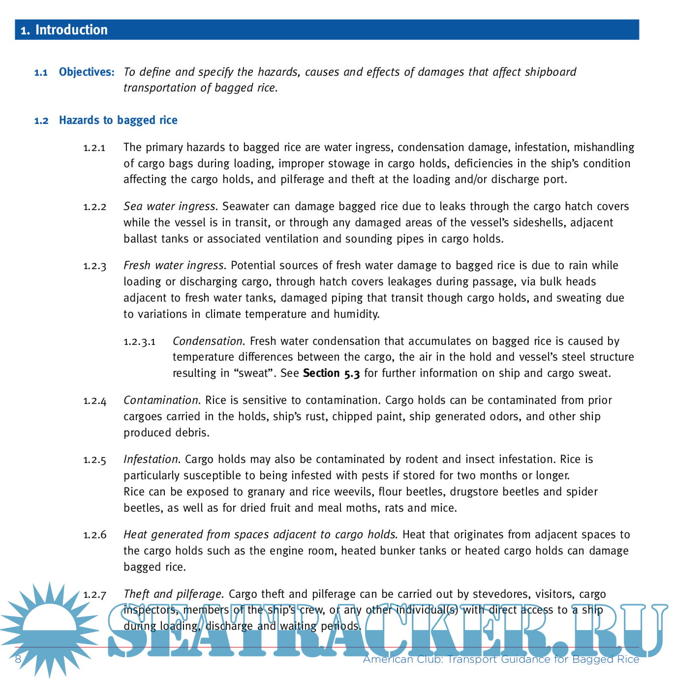 Transport Guidance for Bagged Rice draws upon the knowledge and experience which The American Club has derived from its own claims, from those who are engaged in the operation and/or chartering of ships for the carriage of bagged rice, and from surveyors whose professional experience on behalf of P&I insurers, and from owners and charterers alike.