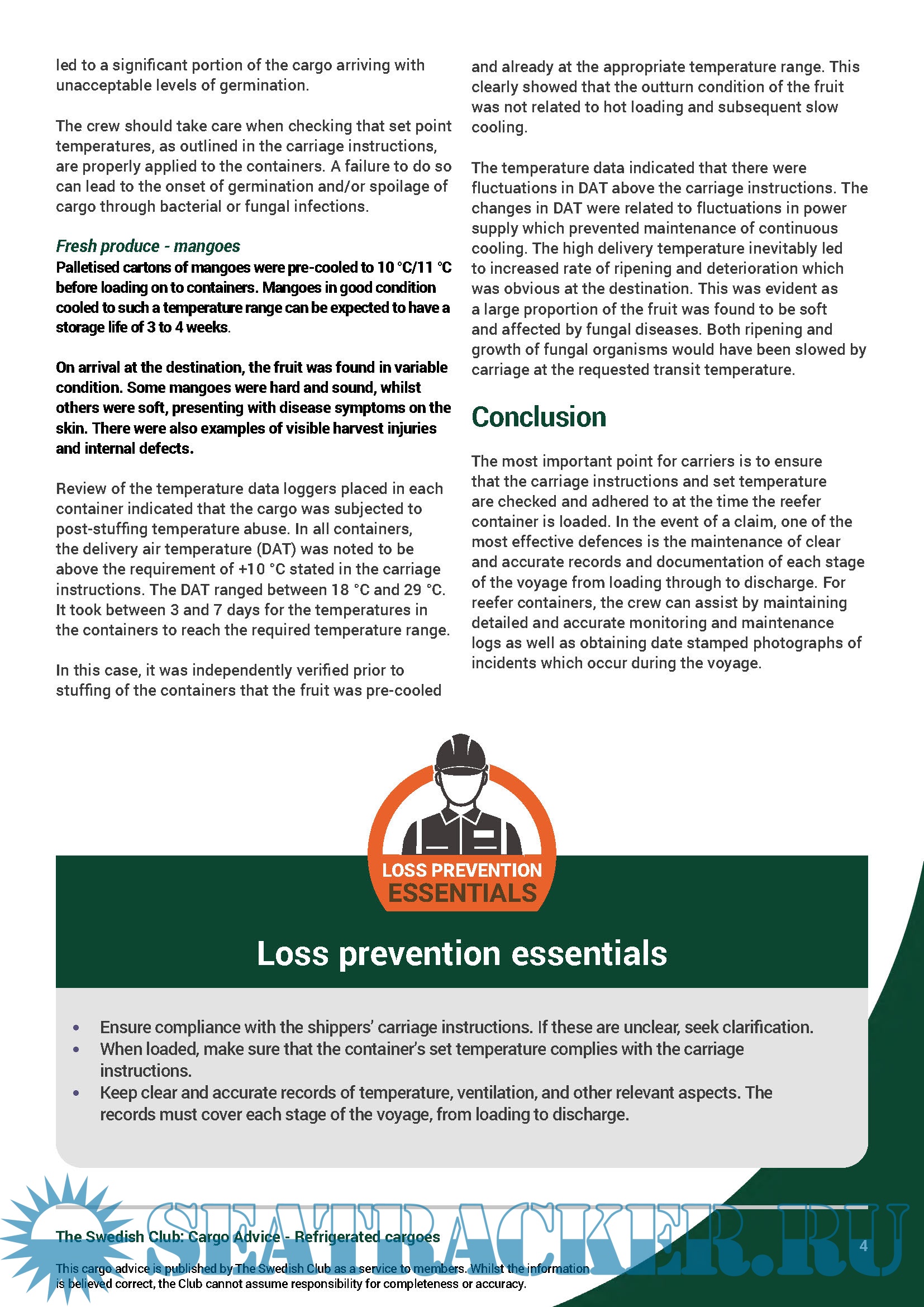 Year: 2021 Language: english Author: The Swedish Club Genre: Guide Format: PDF Quality: eBook Pages count: >0 Description: The Swedish Club recently launched a cargo advice Guide, focusing on Refrigerated Cargoes carriage. In collaboration with the cargo experts at CWA International, The Swedish Club has produced cargo advice to assist our members in the daily operation of their vessels. This month, we wish to highlight the refrigerated cargo advice. A wide variety of refrigerated goods are carried in reefer containers of which fresh produce, frozen meat & fish, dairy products and pharmaceuticals are only a few. A single reefer container may carry a cargo value of several hundred thousand US dollars or more. Refrigerated cargoes are one of the most common types of cargoes involved in cargo claims. Each type of cargo varies in its requirements for carriage temperature, humidity, stowage arrangements and ventilation. By adhering to the recommendations given in the advice, the risk of suffering a claim will be reduced. :