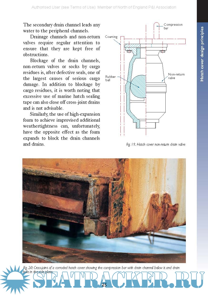Year: 2005 Language: english Author: David Byrne Genre: Guide Publisher: North P&I Club Edition: 2nd 2010? ISBN: 9780954653729 Format: PDF Quality: eBook (electronic version) Pages count: 65 Description: This illustrated guide explains the fundamental importance of weathertight hatch covers to the safe and profitable operation of cargo ships. Poorly maintained or secured hatch covers can result in total losses in heavy seas and are one of the principal sources of cargo damage claims. The guide describes the various types of hatch cover in use today and explains how they should be inspected, maintained and operated to ensure maximum effectiveness and safety. The second edition has been extensively revised and updated and includes information on hatch cover testing, recent IACS contributions to hatch cover design and operation, plus a glossary of terms. The guide is intended for ships’ officers, ship operators, technical staff, surveyors, lawyers and claims handlers. The objective of this guide remains as before: to provide information in straightforward way to those on board ship and those ashore who have an interest in the voyage. The aim is to provide practical guidance to the target audience of ships’ officers, ship operators, technical staff, surveyors, lawyers and claims handlers. The guide deals with hatch cover design principles, operation, maintenance and safety. Appendices are included which provide checklists for routine onboard inspections, notes on recent IACS contributions to hatch cover design and operation, and a glossary of terms.