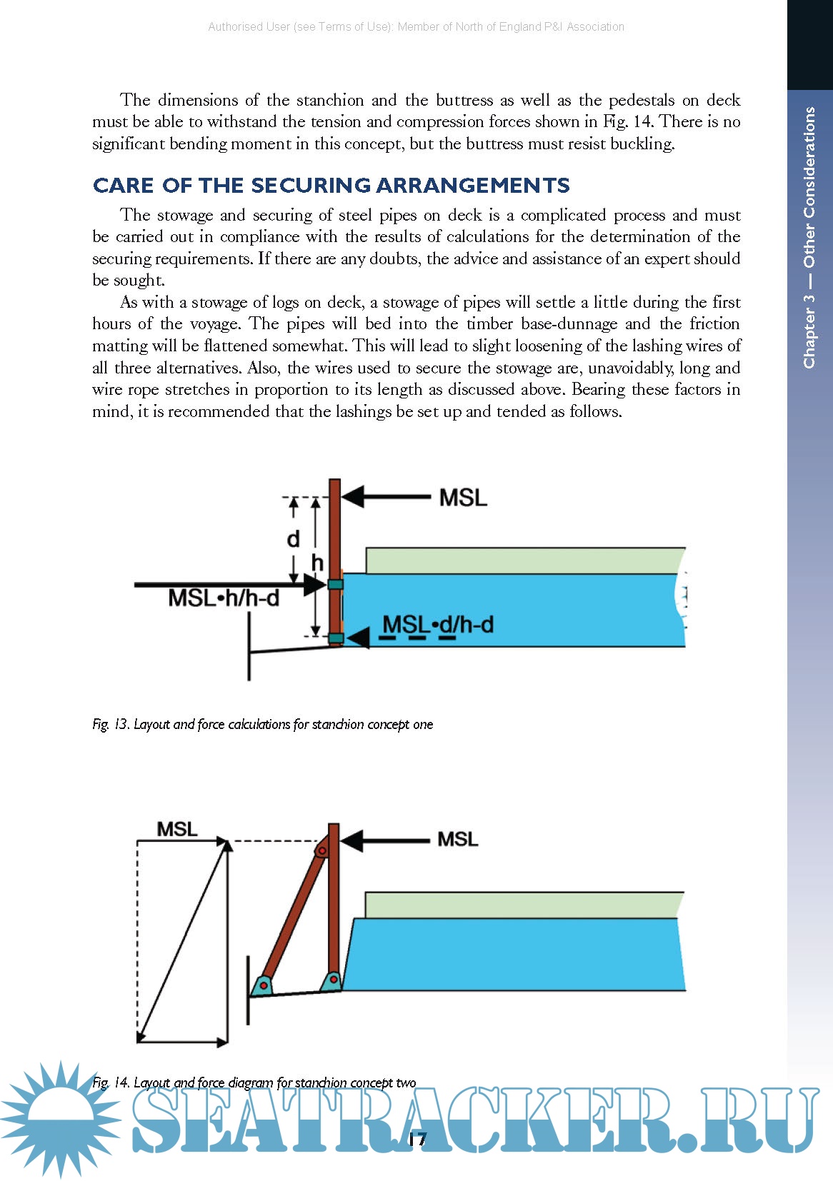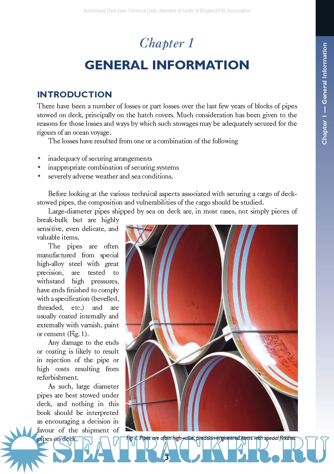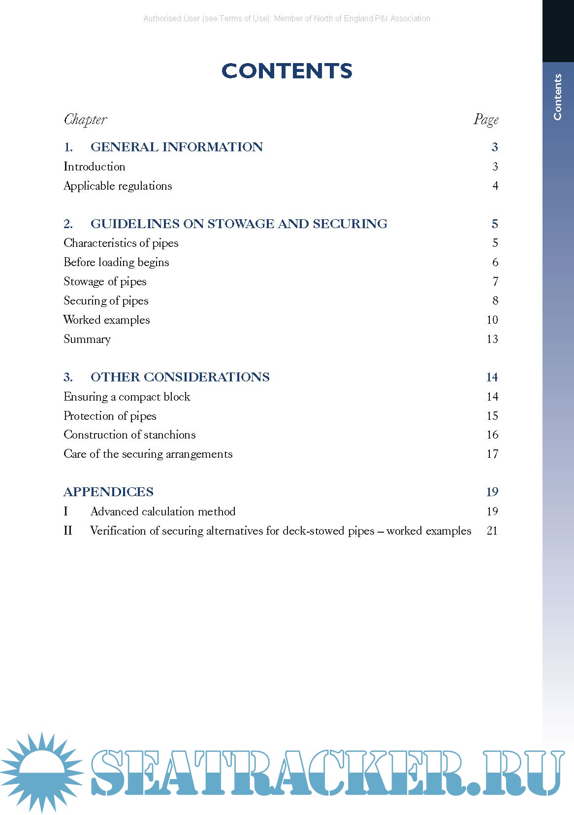 Year: 2008 Language: english Author: Charles Bliault, Hermann Kaps Genre: Guide Publisher: North P&I Club Edition: 1st (electronic version) ISBN: 9780955825705 Format: PDF Quality: eBook Pages count: 33 Description: Due to the size and weight of pipes, they tend to be carried on the decks of cargo ships rather than in the holds. This exposes ship owners to considerably higher risk of damage and loss claims. This publication provides comprehensive guidance on the stowage of pipe cargoes, in line with applicable IMO regulations. This guide helps to prevent inadequate or inappropriate pipe stowage and securing, stressing the importance of regularly tending to securing arrangements during a voyage. Worked examples show how all three securing methods can be properly verified using the advanced calculation method from the IMO Code of Safe Practice for Cargo Stowage and Securing. There have been a number of losses or part losses over the last few years of blocks of pipes stowed on deck, principally on the hatch covers. Much consideration has been given to the reasons for those losses and ways by which such stowage may be adequately secured for the rigours of an ocean voyage. The losses have resulted from one or a combination of the following: • Inadequacy of securing arrangements • inappropriate combination of securing systems • severely adverse weather and sea conditions. Before looking at the various technical aspects associated with securing a cargo of deck stowed pipes, the composition and vulnerabilities of the cargo should be studied. Large diameter pipes shipped by sea on deck are, in most cases, not simply pieces of break bulk but are highly sensitive and valuable items. :