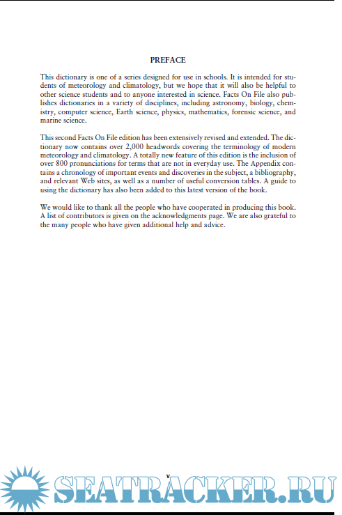 Description: This dictionary is one of a series designed for use in schools. It is intended for students of meteorology and climatology, but we hope that it will also be helpful to other science students and to anyone interested in science. Facts On File also publishes dictionaries in a variety of disciplines, including astronomy, biology, chemistry, computer science, Earth science, physics, mathematics, forensic science, and marine science.