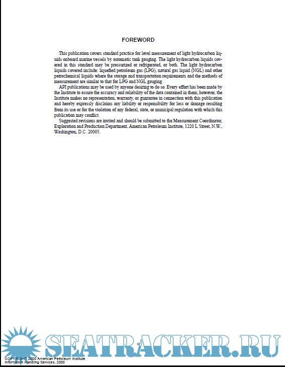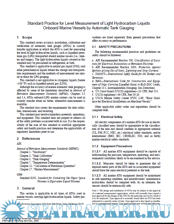 Year: 1997 Language: english Author: API Genre: Guide Format: PDF Quality: eBook Pages count: 18 Description: Manual of Petroleum Measurement Standards Chapter 3—Tank Gauging - Section 5—Standard Practice for Level Measurement of Light Hydrocarbon Liquids Onboard Marine Vessels by Automatic Tank Gauging