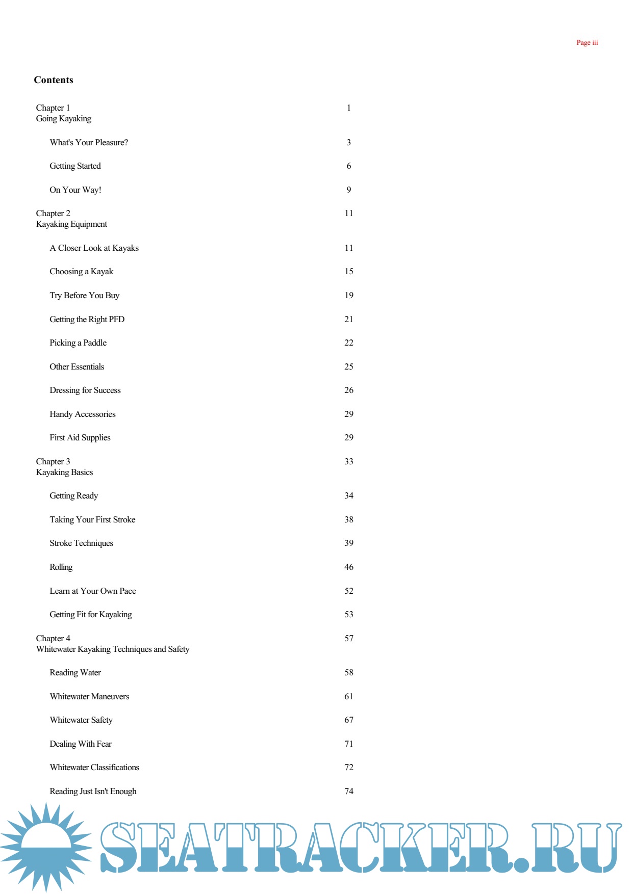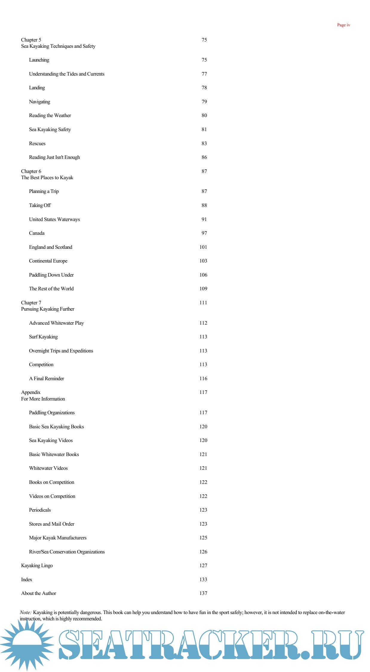 Description: Kent Ford, a kayaking instructor and 2-time world-champion paddler, aims to give readers a solid foundation on which to build their kayaking skills. The book covers all the basics beginners need to get started, including information on determining kayaking preference, choosing proper equipment and clothing, 7 fundamental kayaking strokes and getting in shape for kayaking. The book features clear and accurate instruction and full-colour photographs and instructions throughout for demonstrating proper technique. The book also provides detailed information on how to kayak correctly and safely. Readers interested in whitewater kayaking will learn how to handle rocks, eddies, waves and holes; how to perform whitewater manoeuvers; and how to avoid or deal with river hazards. For those who want to try sea kayaking, the book explains how to recover from a capsize, how to deal with the wind and weather, how to use the tides and current, and how to plan an easy day trip. Readers can also read about 64 of the best kayaking destinations in the United States, Mexico, Canada, England and Scotland, continental Europe and Australia, plus 9 of the author's favourite rivers.