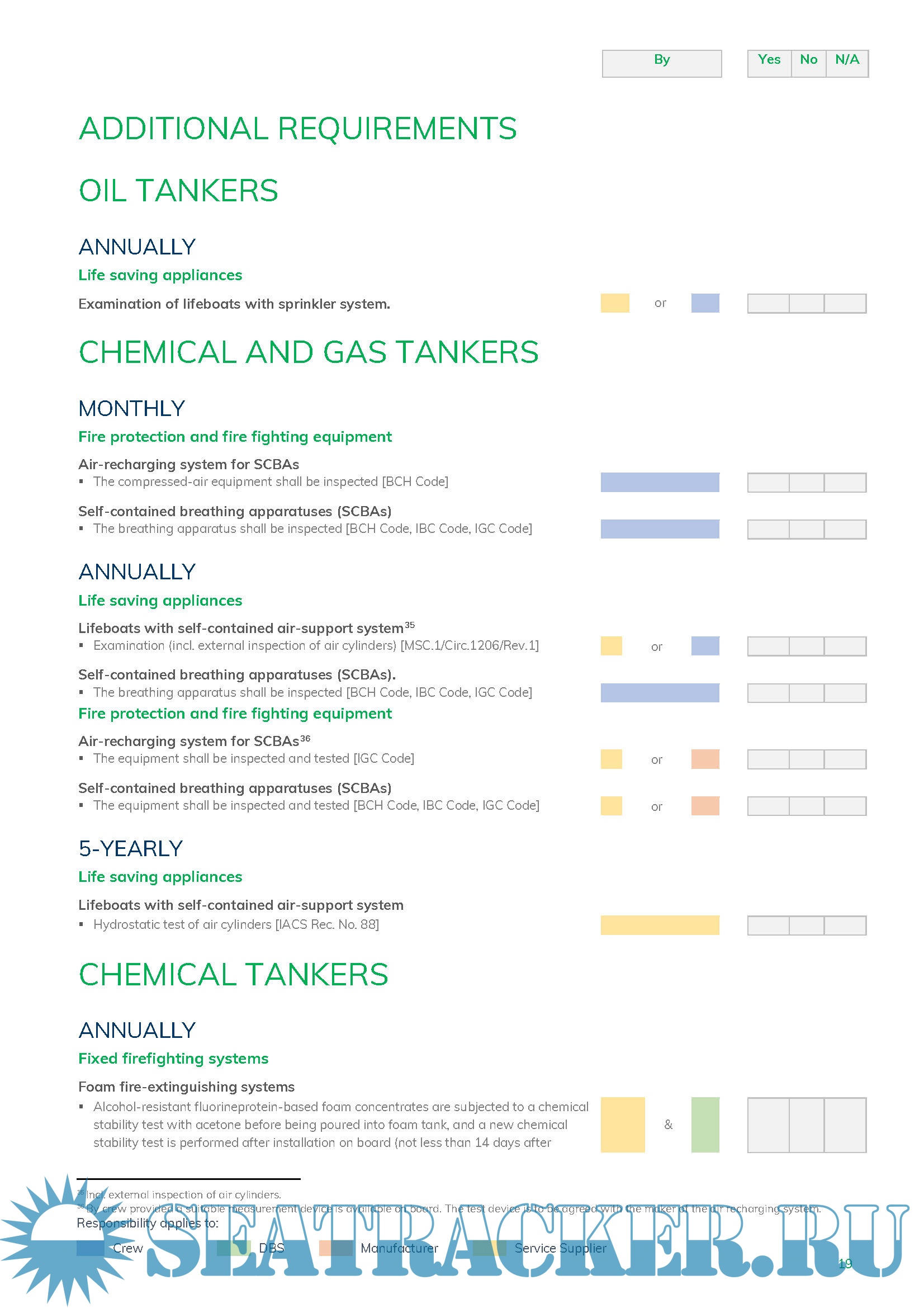 Year: 2020 Language: english Author: DBS Format: PDF Quality: eBook Pages count: 27 Description: DBS is releasing the updated technical publication concerning the requirements for maintenance and inspection of firefighting, lifesaving and radio equipment as well as drills as per statutory instruments. The publication includes requirements for: On-board Maintenance & Inspection of Fire Protection Systems and Life-Saving Appliances Servicing, Inspection & Testing of Accommodation Ladders, gangways, davits and winches Servicing, Inspection & Testing of Launching Appliances (davit and winch) Servicing, Inspection & Testing of Lifeboat on-load release gear Servicing, Inspection & Testing of Davit-launched liferaft automatic release hooks Servicing, Inspection & Testing of Radio and Navigation Equipment On-board Training and Drills The information should be used for the ship’s on board maintenance plan as required by SOLAS regulation II-2/14. In accordance with ISM Code Section 10.1 the safety management system of the company must provide a maintenance plan which ensures maintenance and inspection of the ship and equipment according to the relevant rules and regulations, codes, guidelines and standards.