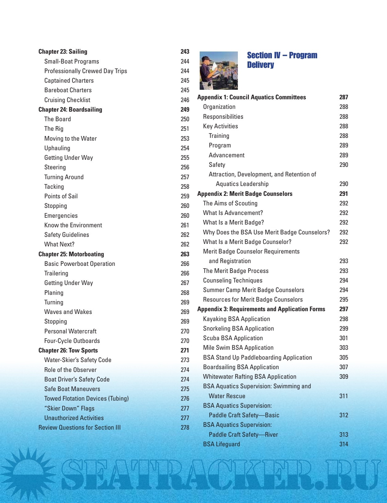 Year: 2018 Language: english Author: Collective Genre: Manual Publisher: Boy Scouts of America Format: PDF Quality: eBook Pages count: 328 Description: Aquatics Supervision: A leader’s guide to youth swimming and boating activities, formerly only available for purchase from online or storefront Scout Shops, is now available for free digital download and may be printed locally. The guide supports the BSA Aquatics Supervision Swimming & Water Rescue and Paddle Craft Safety programs and serves as a resource for the aquatics special awards.