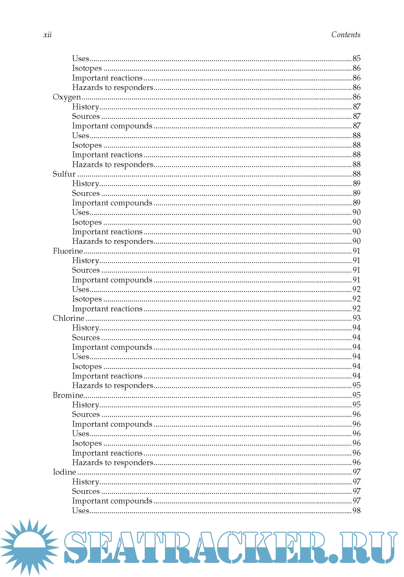 The chapters are organized by the nine U.S. Department of Transportation's hazard classes. Almost every hazardous material presents more than one hazard; the DOT’s placarding and labelling system only identifies the most severe hazards. Therefore, the book provides additional information about hidden hazards for each hazard class. It discusses individual chemicals, their hazards and their physical and chemical characteristics, both as distinct chemicals and within chemical families.