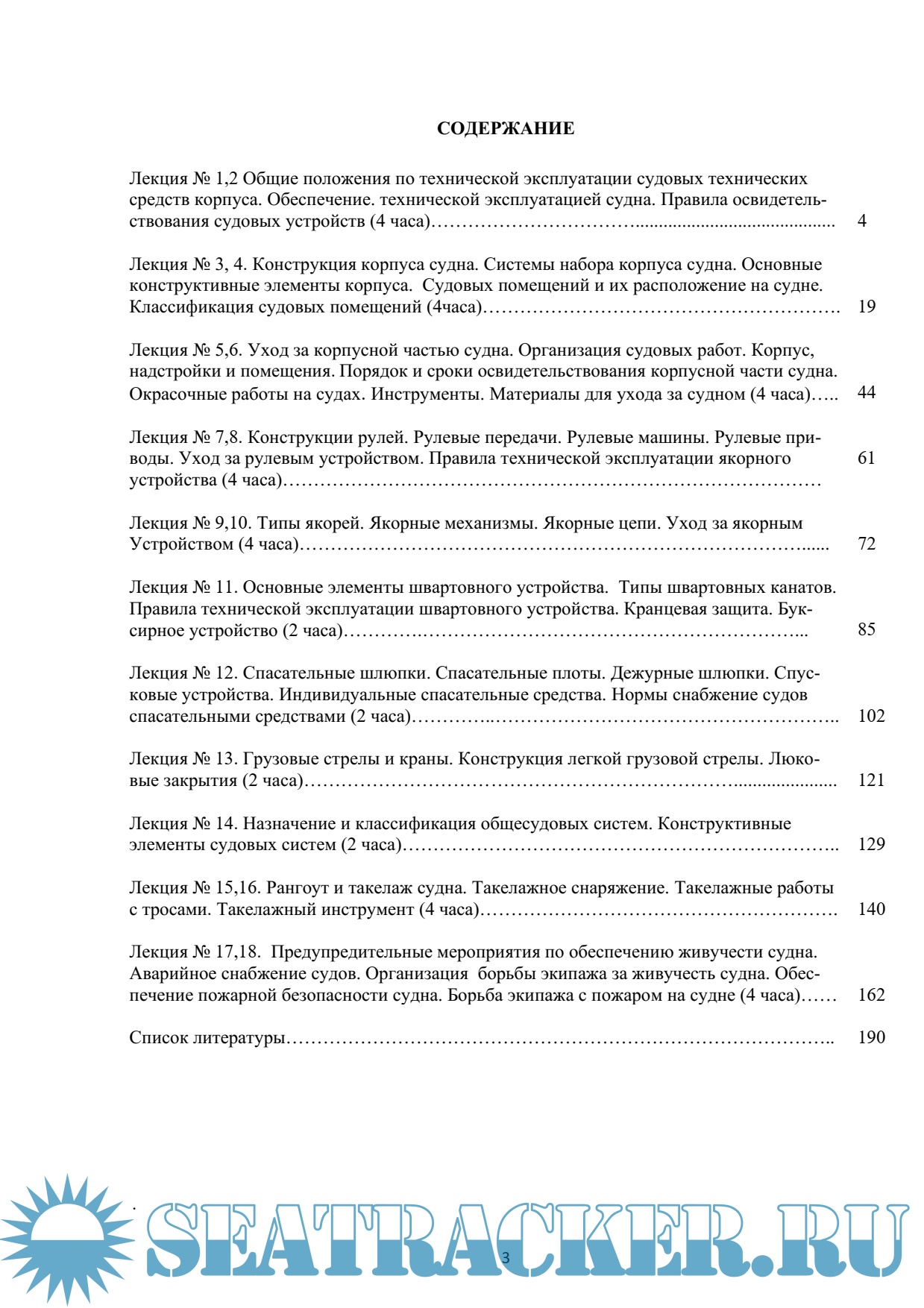 Общие положения по технической эксплуатации судовых технических средств корпуса. Обеспечение. технической эксплуатацией судна. Правила освидетельствования судовых устройств. Конструкция корпуса судна. Системы набора корпуса судна. Основные конструктивные элементы корпуса. Судовых помещений и их расположение на судне. Классификация судовых помещений. Уход за корпусной частью судна. Организация судовых работ. Корпус, надстройки и помещения. Порядок и сроки освидетельствования корпусной части судна. Окрасочные работы на судах. Инструменты. Материалы для ухода за судном. Конструкции рулей. Рулевые передачи. Рулевые машины. Рулевые приводы. Уход за рулевым устройством. Правила технической эксплуатации якорного устройства. Типы якорей. Якорные механизмы. Якорные цепи. Уход за якорным устройством. Основные элементы швартовного устройства. Типы швартовных канатов. Правила технической эксплуатации швартовного устройства. Кранцевая защита. Буксирное устройство. Спасательные шлюпки. Спасательные плоты. Дежурные шлюпки. Спусковые устройства. Индивидуальные спасательные средства. Нормы снабжение судов спасательными средствами. Грузовые стрелы и краны. Конструкция легкой грузовой стрелы. Люковые закрытия. Назначение и классификация общесудовых систем. Конструктивные элементы судовых систем. Рангоут и такелаж судна. Такелажное снаряжение. Такелажные работы с тросами. Такелажный инструмент. Предупредительные мероприятия по обеспечению живучести судна. Аварийное снабжение судов. Организация борьбы экипажа за живучесть судна. Обеспечение пожарной безопасности судна. Борьба экипажа с пожаром на судне. Список литературы.