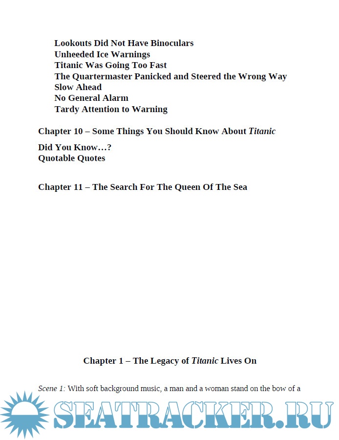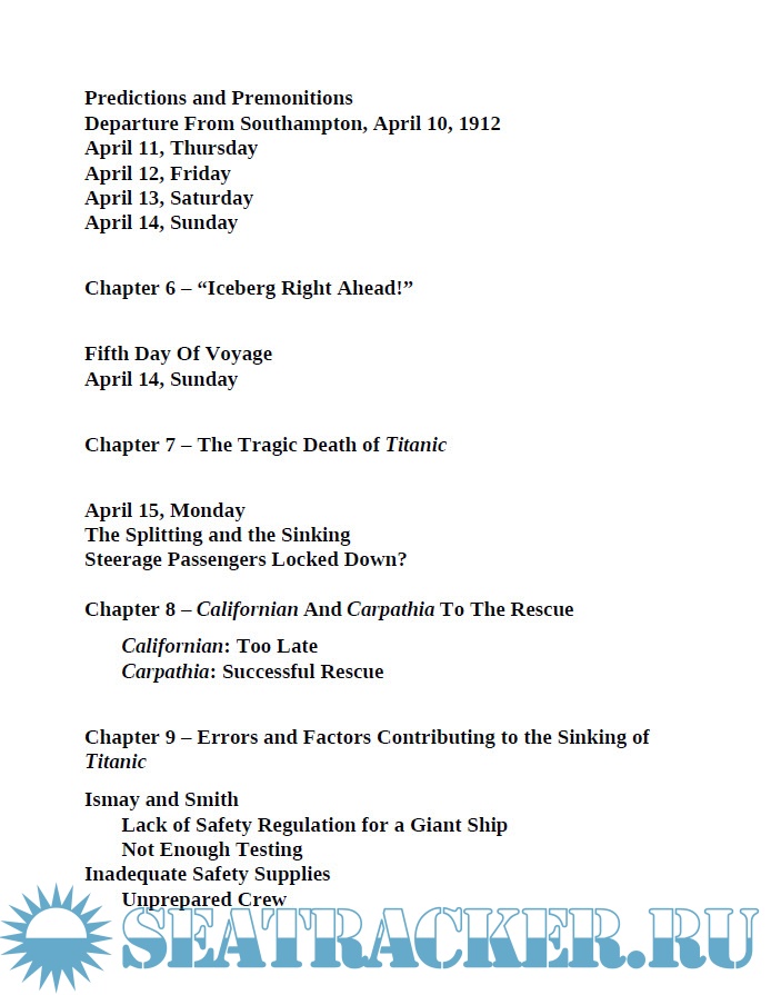 Chapter 1 - The Legacy of Titanic Lives On Chapter 2 - Who's The Fairest Of Them All? Chapter 3 - First-Class, Second-Class, and Steerage Accommodations Chapter 4 - Meet The Captain, The Crew, And The Passengers Of The Ship Chapter 5 - From Southampton to the Night of the Collision Chapter 6 - "Iceberg Right Ahead!" Chapter 7 - The Tragic Death of Titanic Chapter 8 - Californian And Carpathia To The Rescue Chapter 9 - Errors and Factors Contributing to the Sinking of Titanic Chapter 10 - Some Things You Should Know About Titanic Chapter 11 - The Search For The Queen Of The Sea