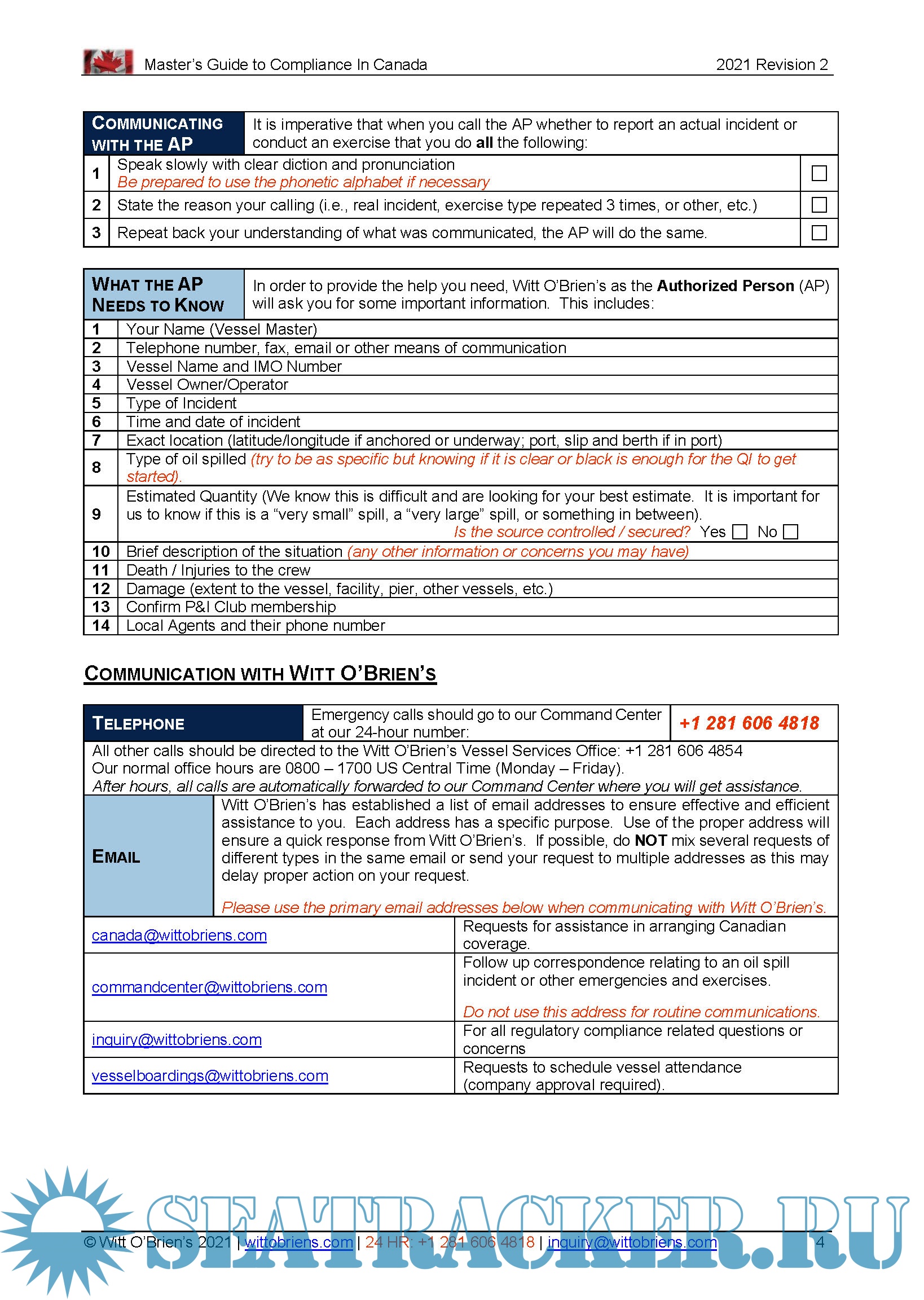 Year: 2021 Language: english Author: Witt O'Brien's Genre: Guide Format: PDF Quality: eBook Pages count: 15 Description: Revision 2 dated October 2021 of Master's Guide to Compliance in Canada This is a practical guide for Masters to assist in compliance with Canadian laws and regulations. It is not an “official” document and is not required for compliance. It is intended to provide useful direction for Masters. It does not replace any document required by law or regulation. It does not replace direction provided by the ship’s owner/manager/operator. This guide may be modified as required to be in harmony with policies of the owner/manager/operator. The Master of any vessel making a call to Canada faces several regulatory issues that are specific to Canada. This guide is intended to help the Master effectively and efficiently face these issues. Witt O’Brien’s is providing this guide to help ensure your compliance. Use of the directions in the guide will allow Witt O’Brien’s to better serve you. Information designed to save you time and effort is present in orange italics