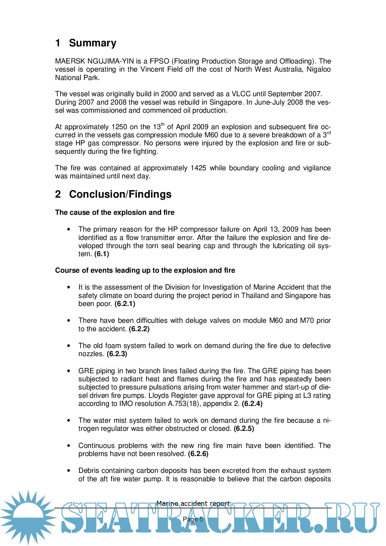 Year: 2009 Language: english Author: Danish Maritime Authority Genre: Documentation Format: PDF Quality: eBook Pages count: 66 Description: MAERSK NGUJIMA-YIN is a FPSO (Floating Production Storage and Offloading). The vessel is operating in the Vincent Field off the cost of North West Australia, Nigaloo National Park. The vessel was originally build in 2000 and served as a VLCC until September 2007. During 2007 and 2008 the vessel was rebuild in Singapore. In June-July 2008 the vessel was commissioned and commenced oil production. At approximately 1250 on the 13th of April 2009 an explosion and subsequent fire occurred in the vessels gas compression module M60 due to a severe breakdown of a 3rd stage HP gas compressor. No persons were injured by the explosion and fire or subsequently during the fire fighting.