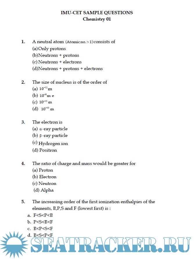 All the questions in IMU Common Entrance Test (CET) are generally asked from the syllabus of Science subjects (Physics, Chemistry and Mathematics) of Higher Secondary Certificate Examination (10+2), recognized by any state/national Board. The candidates have to prepare all the fundamentals of these subjects before appearing for IMUCET Exam.