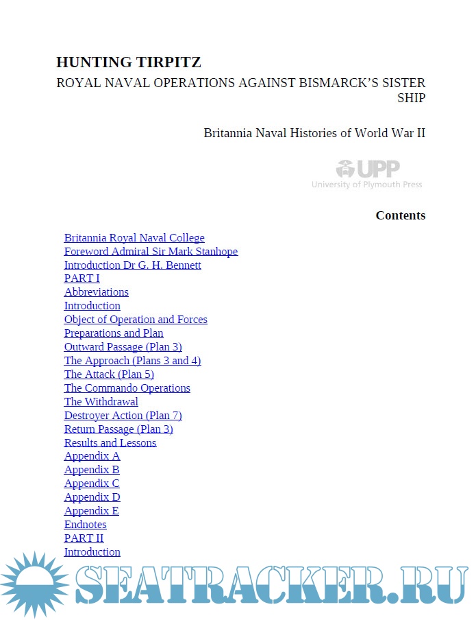 Year: 2017 Language: english Author: G. H. Bennett Genre: History Publisher: University of Plymouth Press ISBN: 978-1-84102-405-9 Format: PDF Quality: eBook Pages count: 351 Description: Originally published as a classified Battle Summary, Hunting Tirpitz is a unique record written by naval officers during World War II, and soon after 1945. Stamped 'restricted' as an officially secret text and held at Britannia Royal Naval College in Dartmouth, South West England. These historical accounts also contain naval maps, plans and first-hand accounts. A substantial contemporary introduction by a naval historian and foreword written by Admiral Sir Mark Stanhope, a naval veteran of the highest order, provides new insights. From 1942 to 1944, battleship Tirpitz was the single most powerful German ship afloat. In northern waters she became the principal target of the capital ships of the Royal Navy. Preventing her breakout into the Atlantic would see desperate and innovative operations by the Royal Navy, from daring raids on the coast of France to the use of midget submarines to place explosive charges underneath the battleship. In 1944, Tirpitz was the target for one of the largest bombing operations in the history of the Fleet Air Arm. The eventual destruction of Tirpitz, in late 1944, was secured by RAF Bomber Command. Hunting Tirpitz includes newly translated, first-hand accounts by German survivors, alongside personal photographs taken on the ship and Battle Summaries which detail: Operation Chariot - the raid on St. Nazaire, 1942 Operation Source - the midget submarine attack on Tirpitz, 1943 Operation Tungsten - the Fleet Air Arm attacks on Tirpitz, 1944.