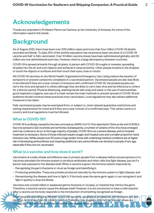 Year: 2022 Language: english Author: International Chamber of Shipping (ICS) Genre: Guide Publisher: Marisec Publications Version: 3.0 Format: PDF Quality: eBook Pages count: 12 Description: This Practical Guide outlines the most up-to-date and relevant information regarding vaccinations for seafarers and includes answers to important questions on availability and efficacy of vaccinations for ships’ crew and shipping companies. The third edition contains: Updated information on the current status of global vaccinations and vaccination guidance relevant to seafarers; and An expanded ‘Key Questions’ section, including new information on multiple doses and types of vaccinations. This guidance document should be read in conjunction with the related set of COVID-19 guidance documents published by ICS which can be downloaded here: https://www.ics-shipping.org/su...-shipping/covid. Additional info: Version 3.0 / February 2022