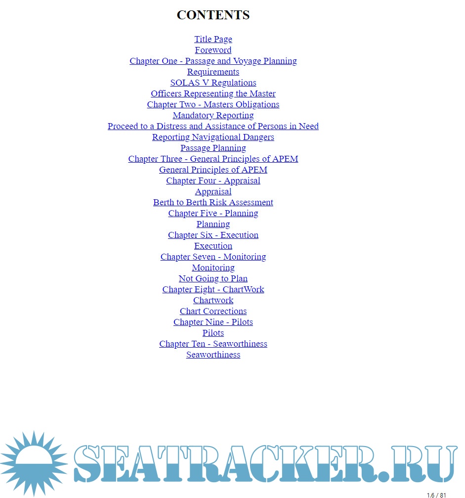 Year: 2017 Language: english Author: Barry Sadler Genre: Guide Format: EPUB Quality: eBook Pages count: 81 Description: This annotated and illustrated, essential guide ensures the reader develops an understanding of the principles of Passage Planning. It's straightforward, concise explanations are aimed to help all deck officers of every rank, including first CoC Deck Hands. The book covers all aspects of passage planning from Appraisal through to Monitoring and aims to, not only, ensure understanding but, how to effectively implement safe, up to date practice on board the bridge of a a ship or yacht. This book can be used an a stand alone publication but also as part of a series of study aids designed to develop a candidates knowledge when undertaking any deck officer orals exam, regardless of tonnage or level.