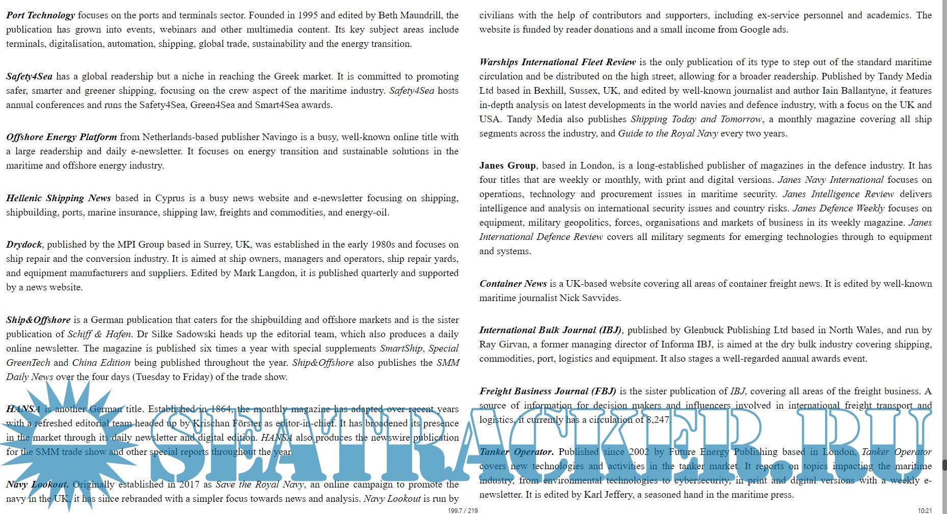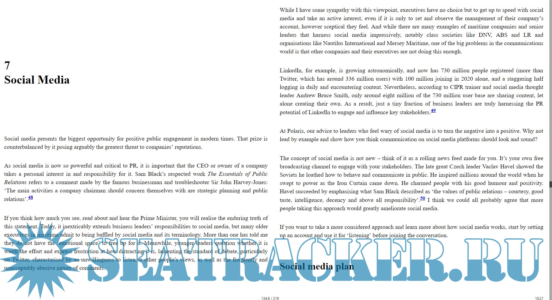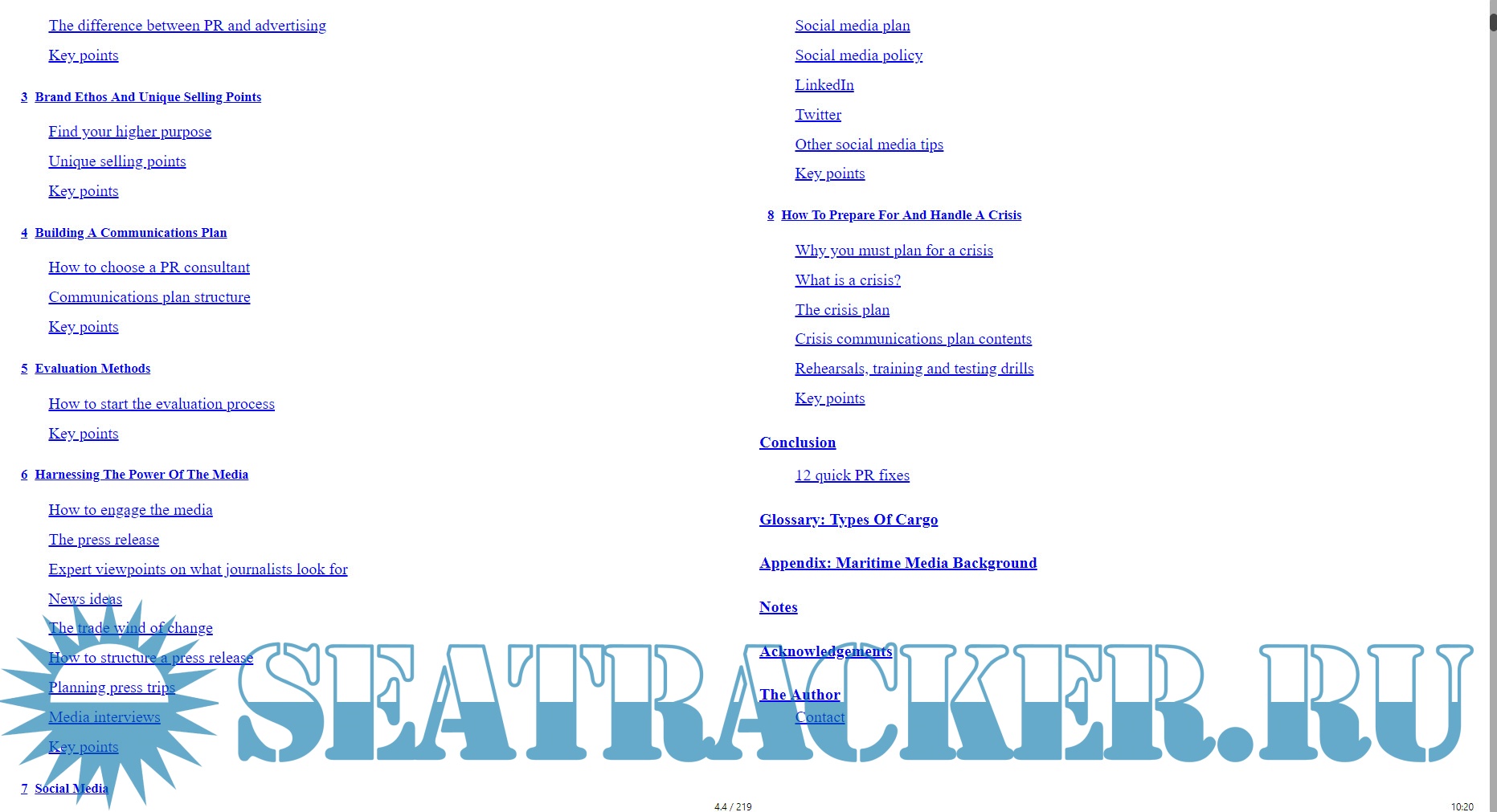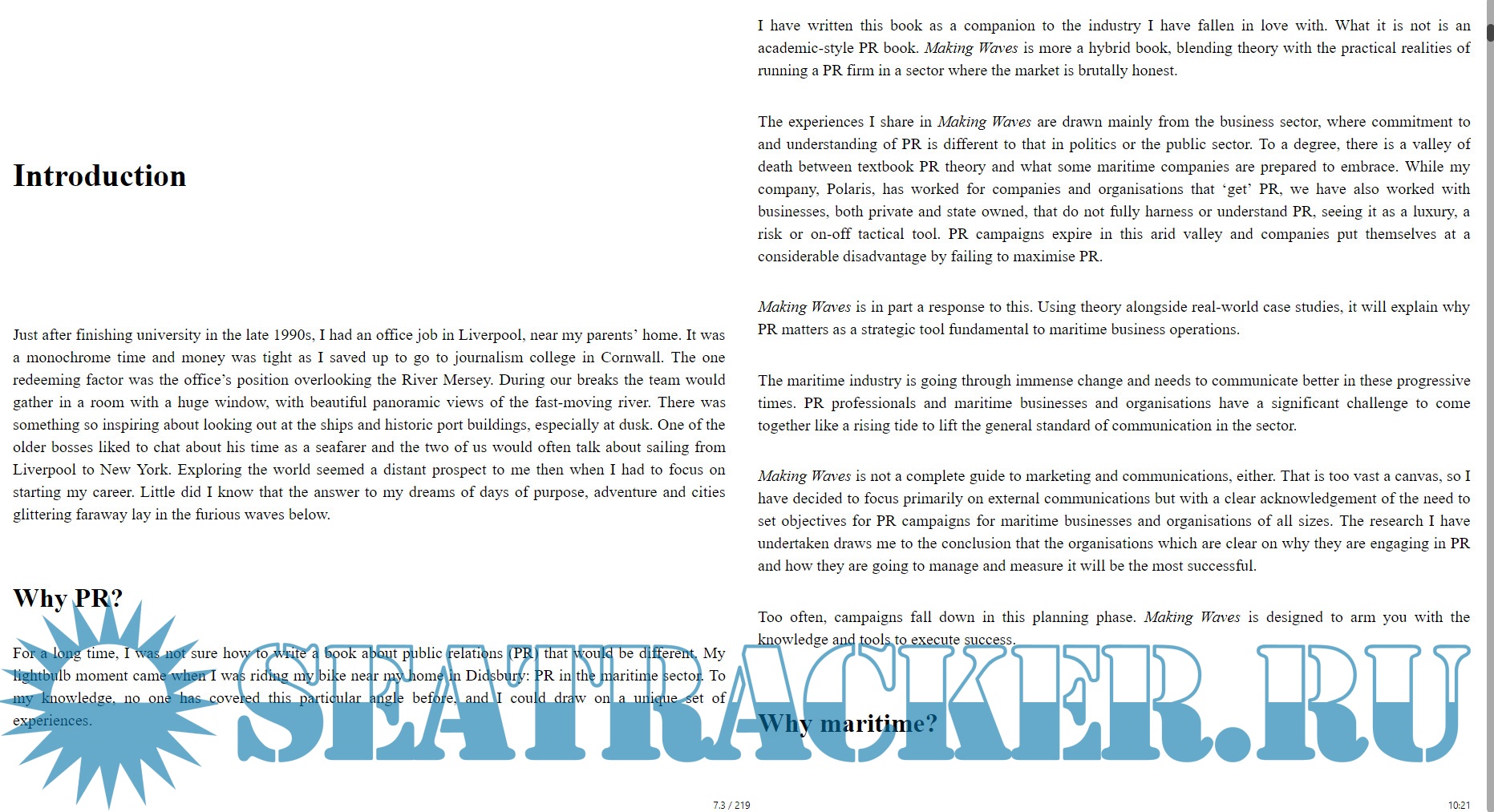 Year: 2021 Language: english Author: Ben Pinnington Genre: Guide Publisher: ReThink Press Format: EPUB Quality: eBook Pages count: 219 Description: Making Waves is an insider’s guide to public relations in the international maritime sector. It sets out in clear, practical steps how you can harness the power of PR to build your profile, win business and prevent crises. Read this book to reap seven rewards of public relations: • Improve reputation: Learn how to influence attitudes and behaviours and build good relations. • Grow awareness: Boost your profile in the local, national and international maritime press and on social media. • Create opportunities: Reach a global audience beyond the limits of your existing network. • Work with key people: Build the profile of your senior team as key people of influence in your niche. • Increase value: Improve the value of your business and increase your price points. • Protect your business: Shield your business from crises through planning. • Find higher purpose: Identify an inspiring ethos and bold message that will galvanise your team, clients and stakeholders. Drive real change in your industry.