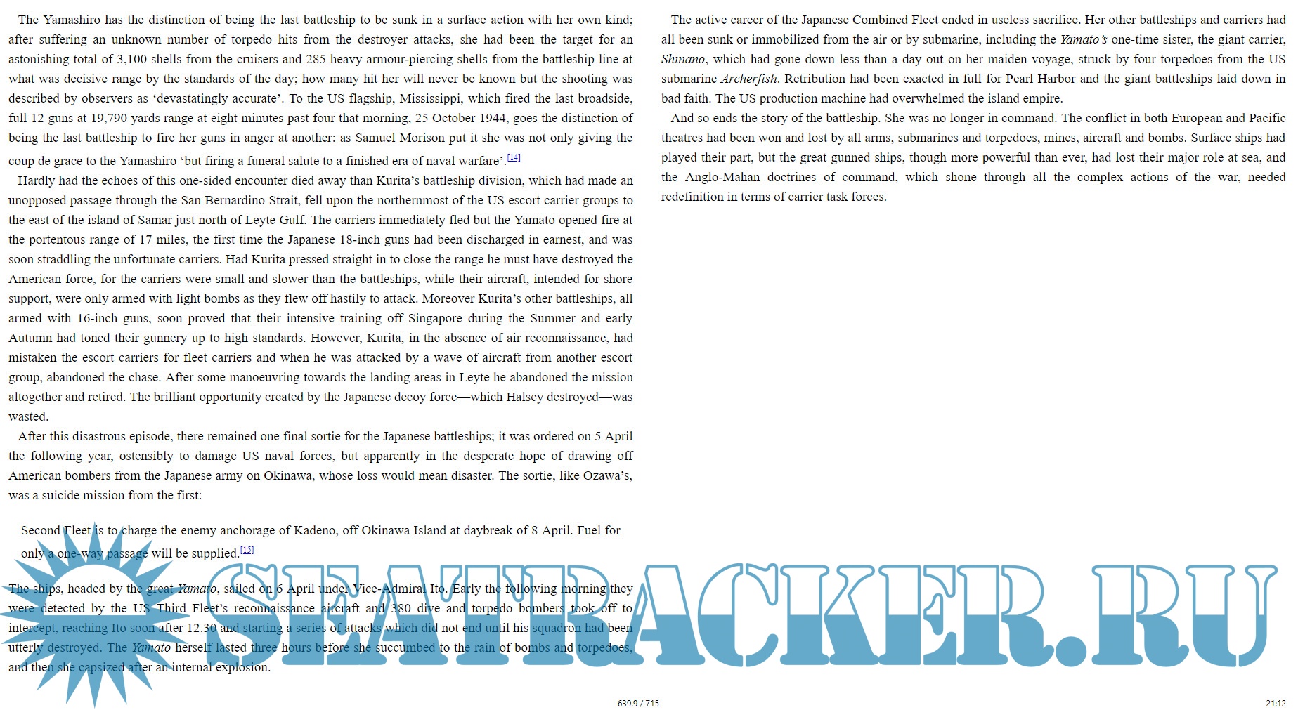 Year: 2020 Language: english Author: Peter Padfield Genre: History Publisher: Lume Books Format: EPUB Quality: eBook Pages count: 474 Description: The battleship reigned supreme at sea from the 1860s to the 1940s, the ultimate symbol of naval power and national pride, queen on the naval chessboard. As a result, strategy and battle tactics changed in response to the mounting of ever larger guns with greater range and penetrative power, and the development of threatening new weapon systems, particularly torpedoes, torpedo boats, mines and submarines. The author also explores the chilling reality of action with vivid descriptions of major naval battles including the Yalu in the first Sino-Japanese War, Tsushima in the Russo-Japanese War, Jutland in the First World War and many lesser known engagements. Battleship describes the evolution from the wooden man-of-war plated with iron armour to the great steel leviathan of the Second World War, and its ultimate displacement as arbiter of naval power by the aircraft carrier.