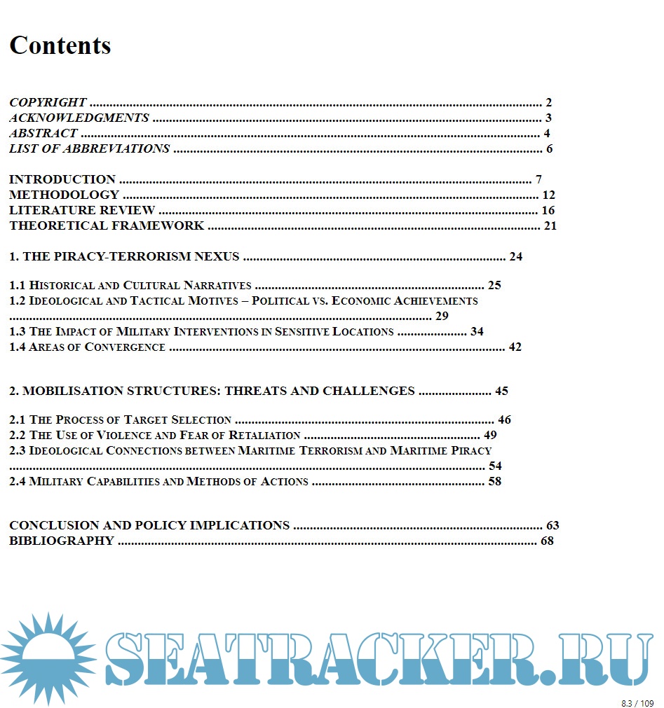 Year: 2019 Language: english Author: Alexandre Granger-Hudji Format: EPUB Quality: eBook Pages count: 82 Description: This project investigates the nature and implications of terrorism and contemporary maritime piracy, drawing a comparative analysis on two relevant spheres of conflict: the Gulf of Aden and the Strait of Malacca. In doing so, the research is conducted within two scopes of investigation. On the one hand, the transition from domestic to transnational terrorism is portrayed by the events of 9/11, hereby representing a historical shift in the field of global security. This will be emphasised by the significant progression of jihadism from 1979 to 2015. This study incorporates the use of qualitative discourse analysis, through the prism of a social constructivist approach combined with the concepts of embedded liberalism and neo-patrimonialism. The empirical data relies on the use of illustrative examples: 9/11, the Abu Sayyaf Group, Somalia, the Strait of Malacca, and a host of other secondary examples referring to Northern Ireland’s IRA, Boko Haram in Nigeria and the Gerakan Aceh Merdeka (GAM) in Indonesia. The study finds that the use of violence is a common characteristic of both actors, sharing similar ideological and tactical motives with mutual intentions to create chaos and provoke instability. Meanwhile, the differences are illustrated throughout the fact that terrorist groups’ interests are mainly of political nature, whereas pirates are driven by financial objectives. The dissertation contributes to the literature with the use of a distinct theoretical framework by shedding light on political, economic, social and cultural aspects that constitute the piracy-terrorism nexus.