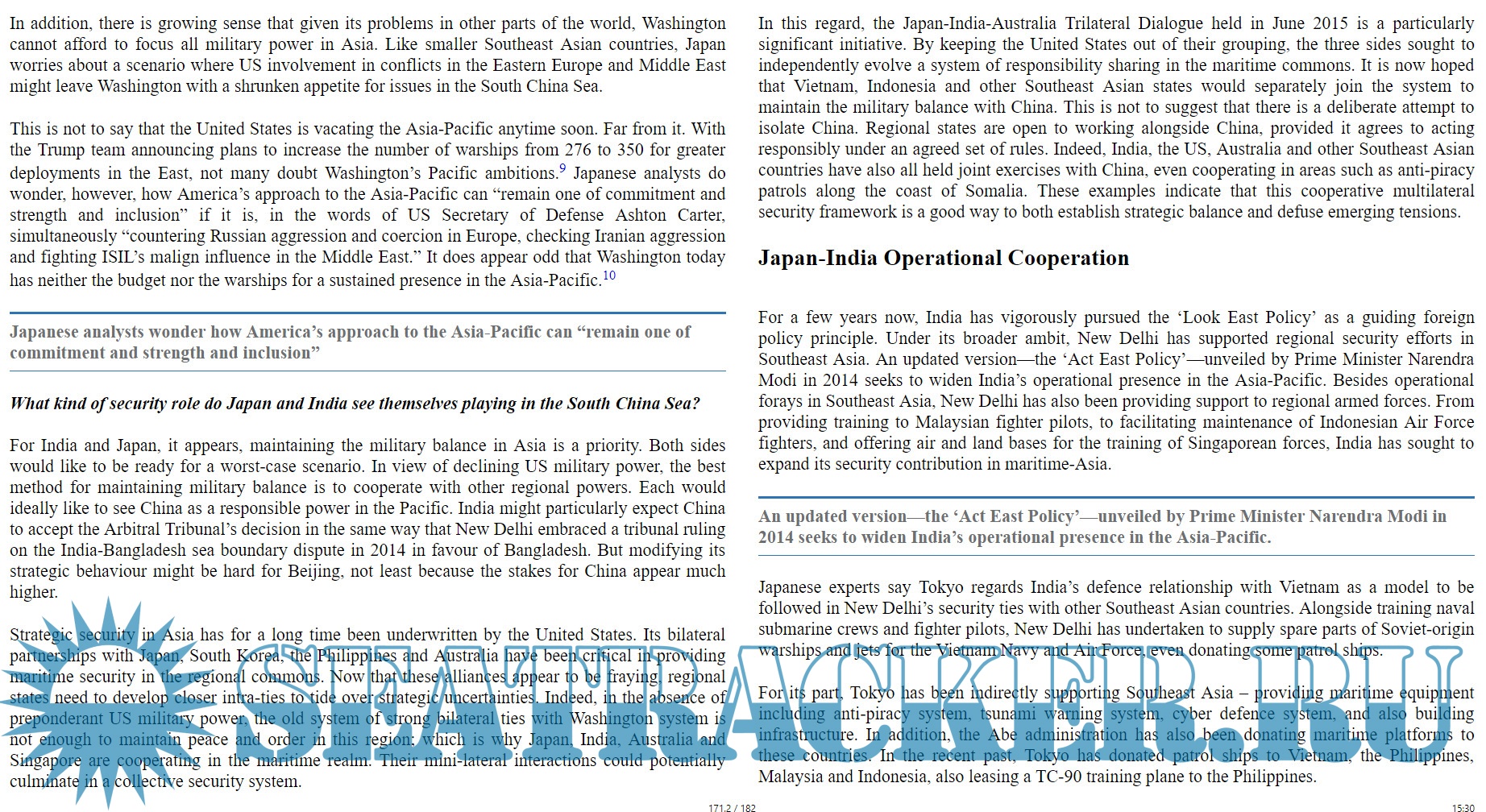 Year: 2017 Language: english Author: Abhijit Singh ISBN: 978-81-86818-27-5 Format: EPUB Quality: eBook Pages count: 152 Description: Line in the Waters looks at emerging security dynamics in the Southeast Asian littorals and their impact on Asian geopolitics and security. It presents country perspectives of the strategic implications of recent developments in the South China Sea, their implications for maritime security and the regional balance of power. After an Arbitral Tribunal pronounced a verdict in July 2016, invalidating China’s historical rights in the South China Sea, there is fear that the dispute might turn into a flashpoint for conflict. Beyond dwelling on the strategic deadlock that characterises the current state-of-play, contributors outline possible solutions and a way forward.