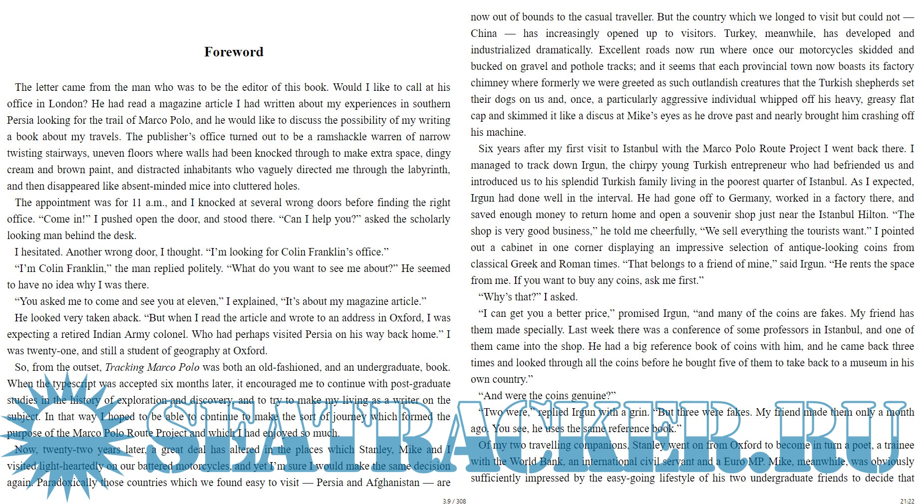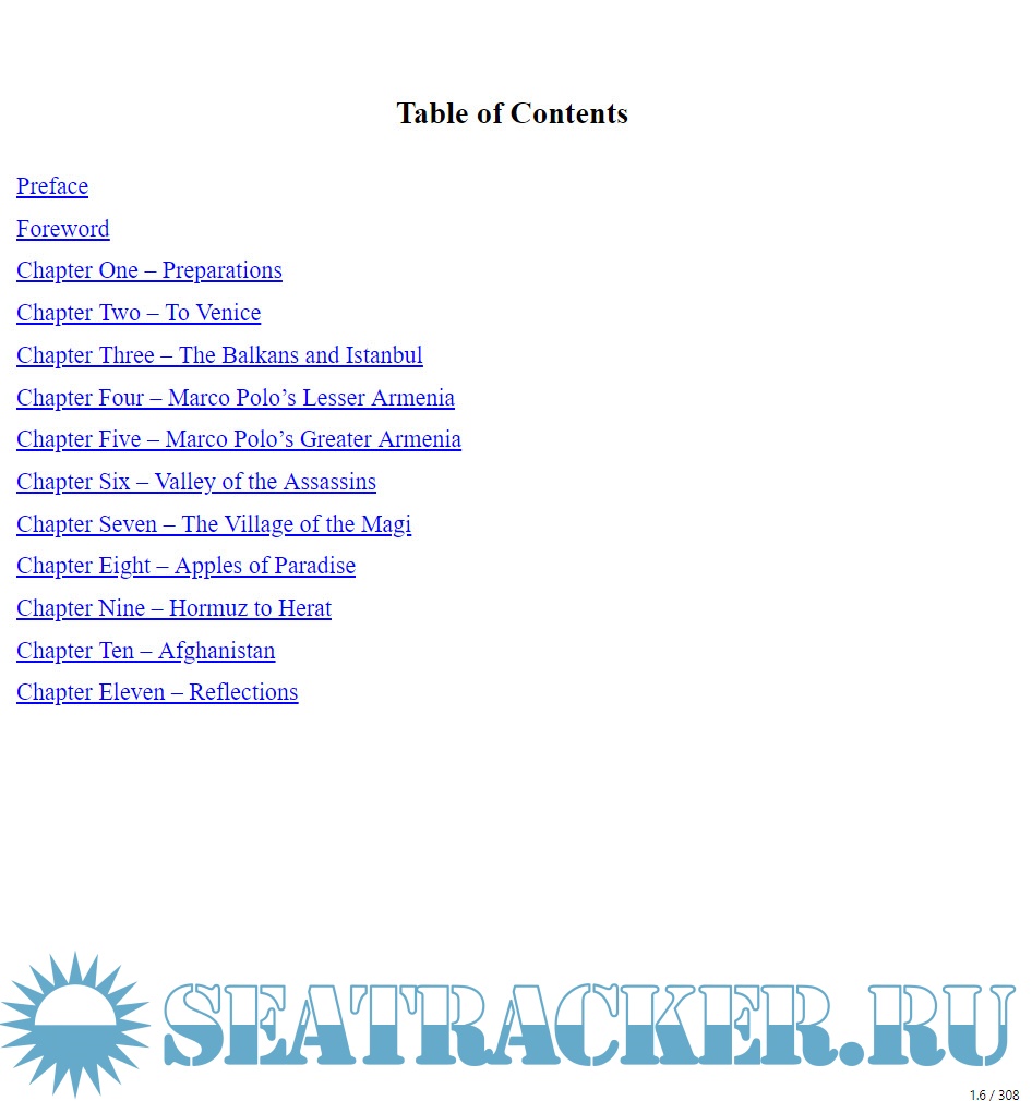 Year: 2018 Language: english Author: Tim Severin Publisher: Lume Books Format: EPUB Quality: eBook Pages count: 308 Description: Marco Polo was one of the greatest explorers of all time. After the best-selling The Brendan Voyage and The Sinbad Voyage, Tim Severin took up the challenge of following in his footsteps. Using the great explorer’s journals as a route guide, Severin followed him all the way from Venice to Afghanistan — on a motorbike. This is his witty and enthralling account of a latter-day caravan through Armenia and Persia, across deserts and mountains, as Severin and his companions overcome crashes, floods, sandstorms and linguistic muddles with zest and ingenuity. Ancient and modern jostle for attention in the bustling towns and panoramic landscapes of Turkey and Afghanistan. Seeking out thirteenth-century Asia, they pass through the Valley of the Assassins to find the village of the Magi. And even with his foot in plaster, Severin takes a camel ride high into the Deh Bakri Pass in search of the famed ‘apples of paradise’. The excitement, the discomfort, and the sheer magic of this epic journey are brought vividly to life by one of Britain’s finest travel writers. Travel alongside Tim Severin as he goes ‘Tracking Marco Polo’.