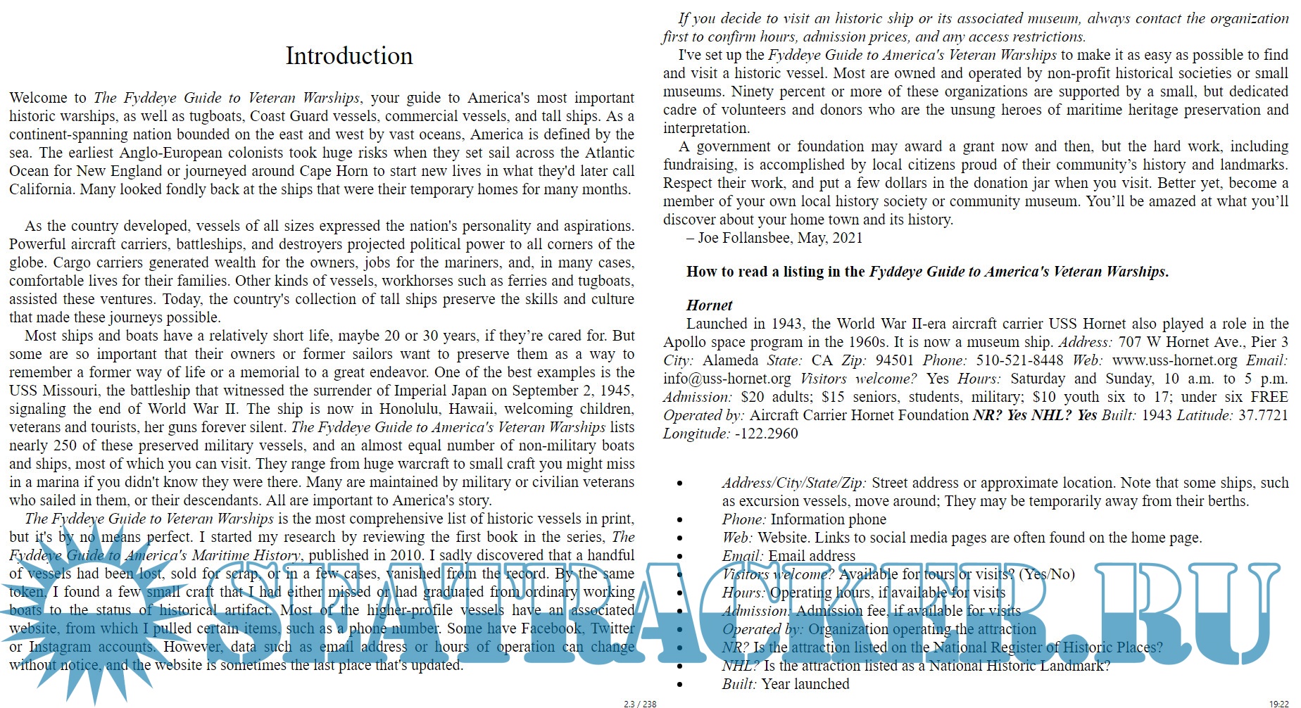 Year: 2021 Language: english Author: Joe Follansbee Format: EPUB Quality: eBook Pages count: 238 Description: Are you a military veteran, history buff, or just curious about America's maritime history? The Fyddeye Guide to America's Veteran Warships is the perfect way to explore more than 500 ships and small craft that played a role in the defense and development of the United States. You'll discover US Navy capital ships, such as aircraft carriers and battleships, that fought fascism on two oceans and preserved our freedoms. US Coast Guard vessels performed rescues, enforced the law, and warned mariners from dangerous shoals. The country's collection of tall ships preserve maritime skills and culture. Nearly 250 naval vessels from the late 18th century to the mid-20th century Aircraft carriers, battleships, cruisers, destroyers, submarines, supply ships, and small craft Commercial cargo ships, tugboats, towboats, lightships, and specialized boats. Dozens of two and three-masted tall ships offering brief excursions, day trips and longer voyages Each listing contains a short description of the vessel, its location, contact information, website, hours and ticket prices. Many vessels are free to board! Notes on whether the vessel is listed on the National Register of Historic Places and/or designated a National Historic Landmark