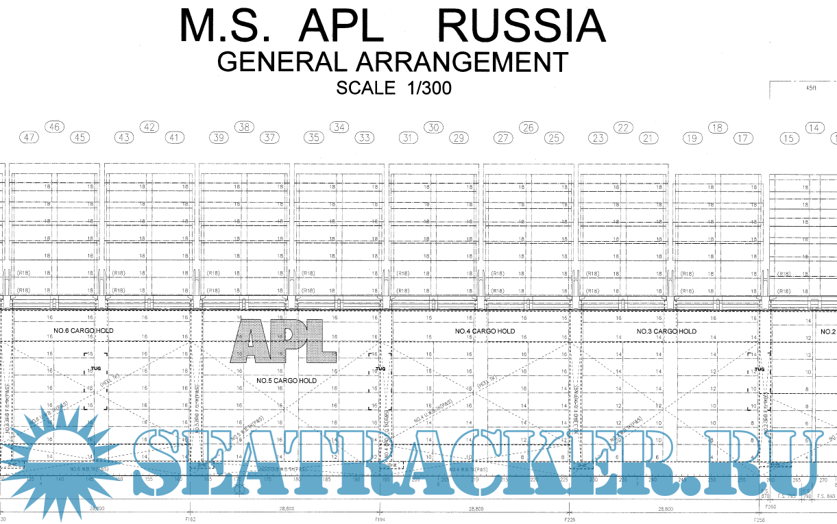 Description: General arrangement plan of very large container ship APL Russia (MOL Comfort) (C series of MOL), 8110 TEU.