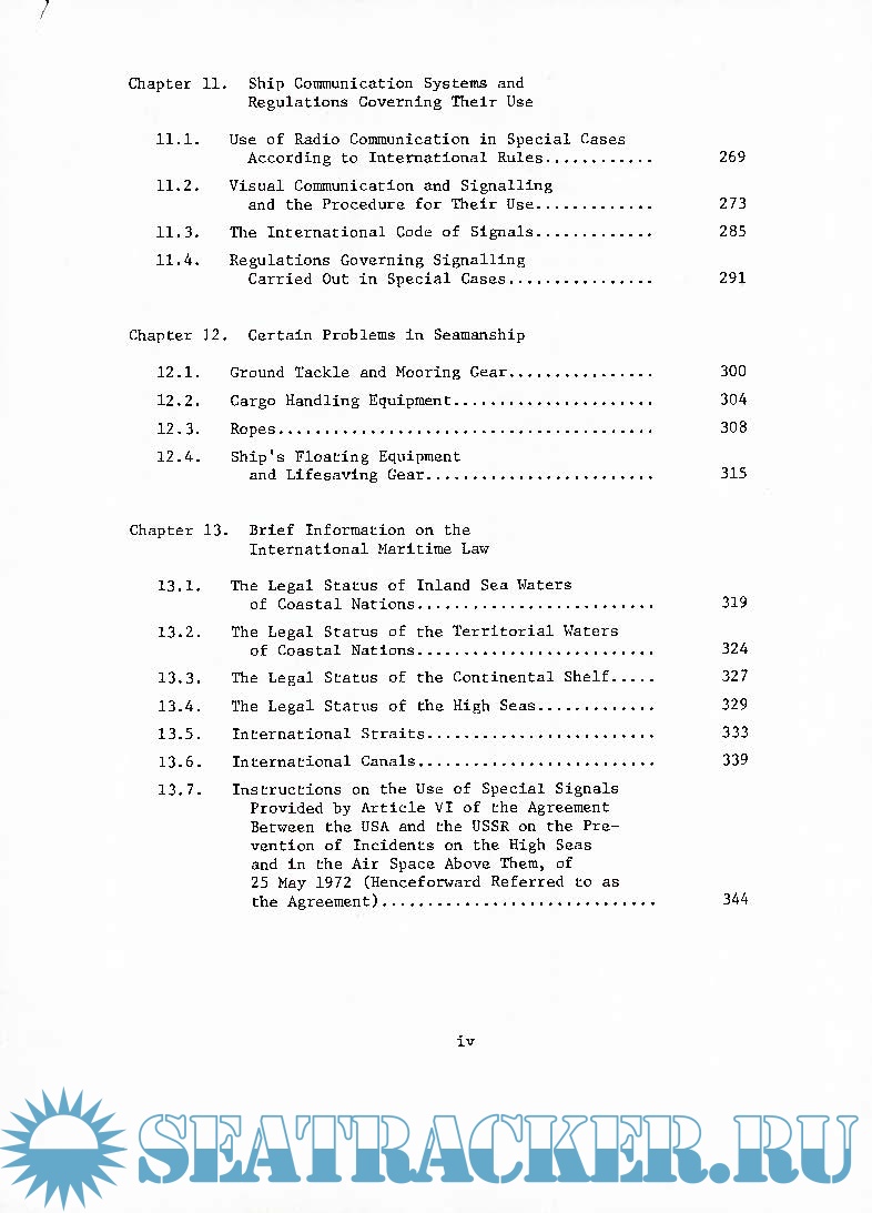 Year: 1967 Language: english Author: Pronichkin A.P. and many Others Genre: Handbook Publisher: Naval Intelligence Support Center Format: PDF Quality: eBook Pages count: 412 Description: Contents: Duties of the officer of the watch; Submarines; Surface vessels; Regulations for preventing collisions at sea and certain other rules regulating movement of ships in the coastal waters; Navigation; Celestial navigation; Principles of ship maneuvering; Shipboard communication systems and rules governing their use; Seamanship; Brief information on international maritime law; Reference data. Color illustrations reproduced in black and white. "GOVERNMENT USE ONLY"