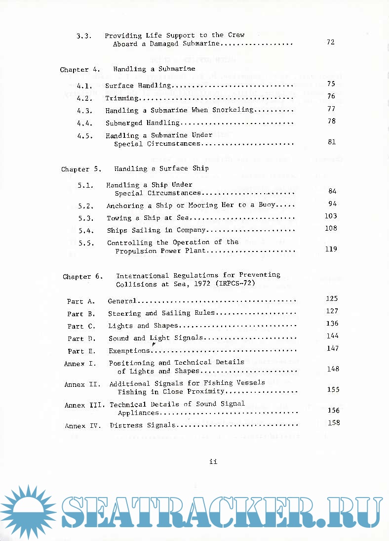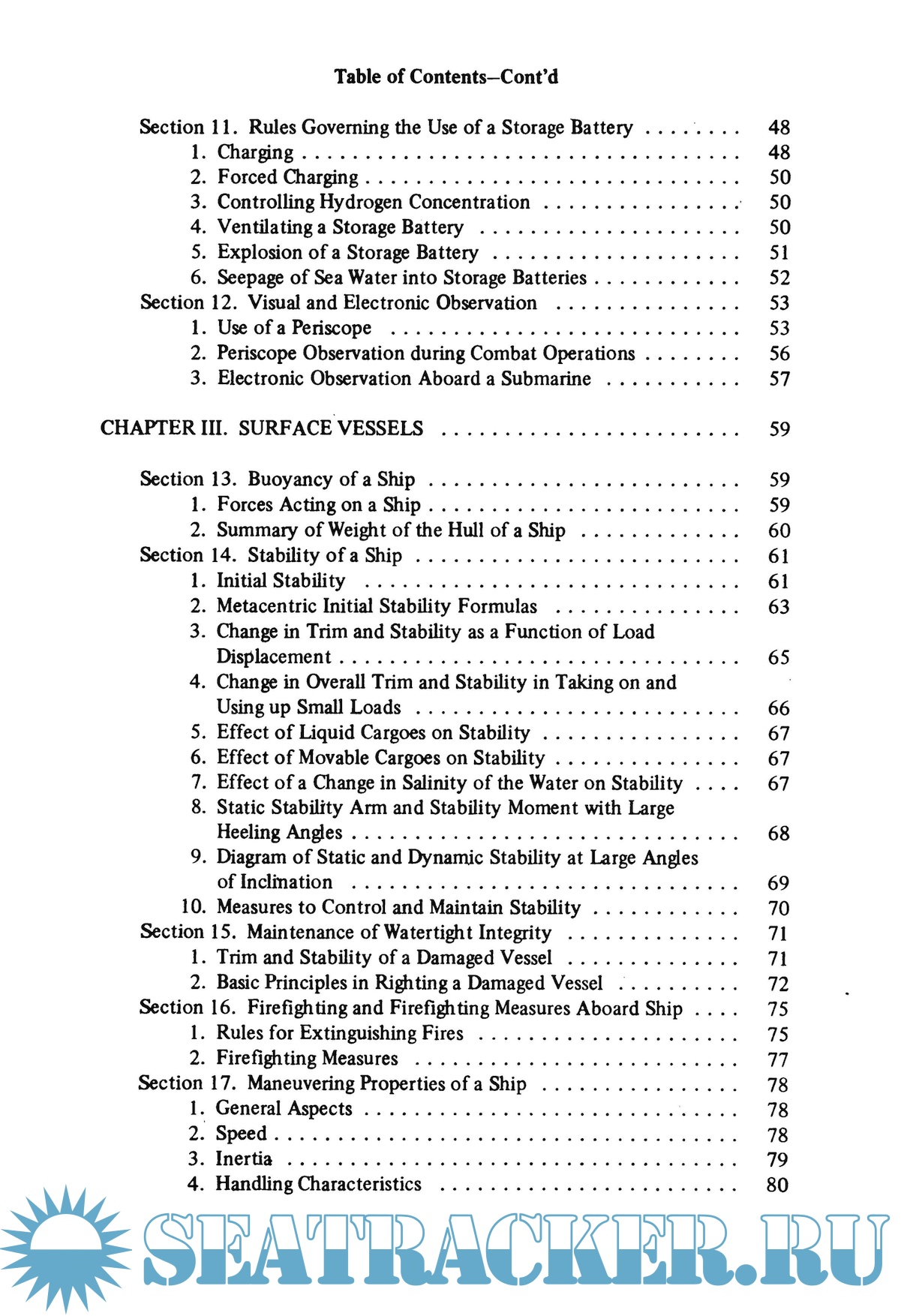 Description: Contents: Duties of the officer of the watch; Submarines; Surface vessels; Regulations for preventing collisions at sea and certain other rules regulating movement of ships in the coastal waters; Navigation; Celestial navigation; Principles of ship maneuvering; Shipboard communication systems and rules governing their use; Seamanship; Brief information on international maritime law; Reference data. Color illustrations reproduced in black and white.