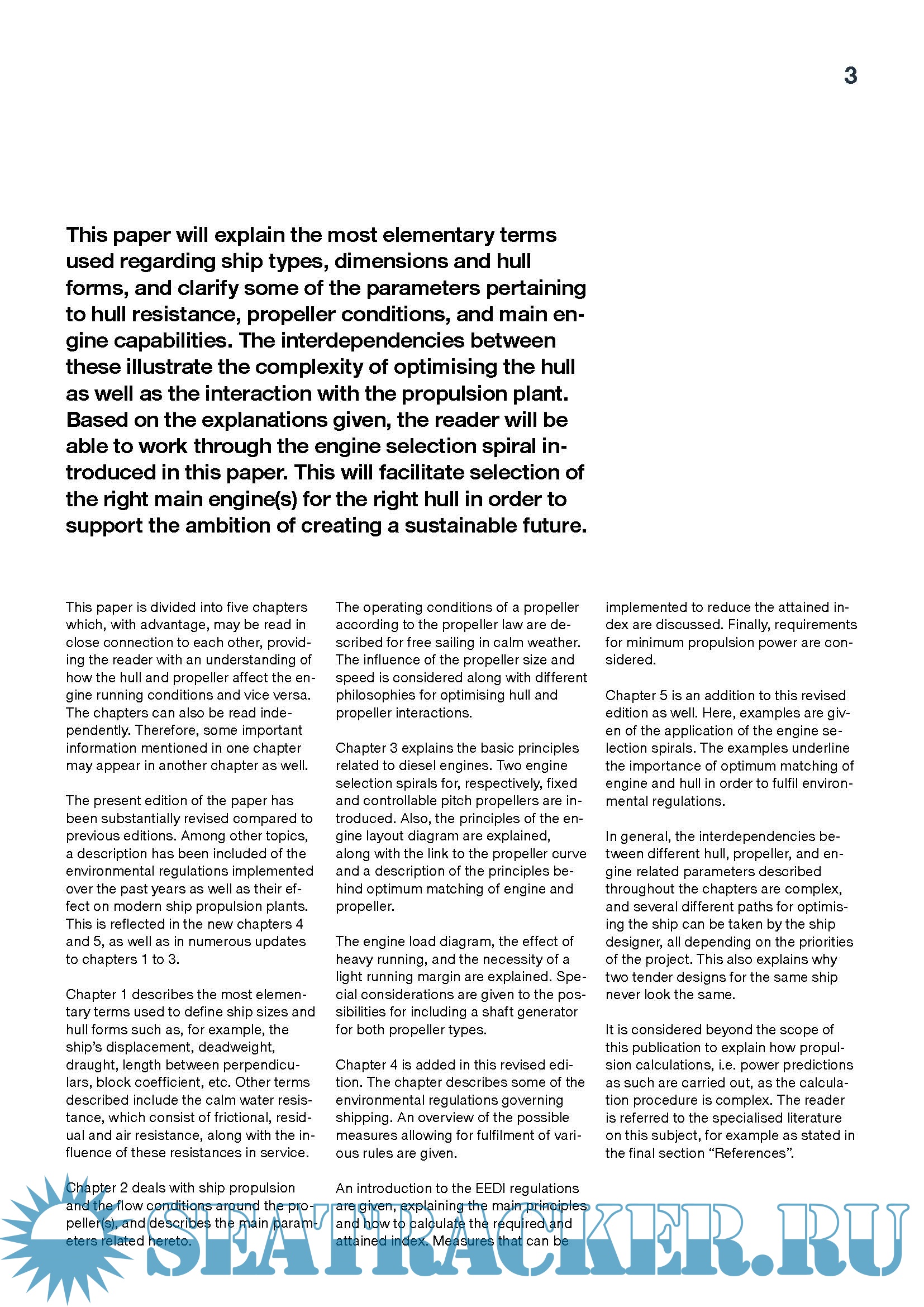 Description: This paper will explain the most elementary terms used regarding ship types, dimensions and hull forms, and clarify some of the parameters pertaining to hull resistance, propeller conditions, and main engine capabilities. The interdependencies between these illustrate the complexity of optimising the hull as well as the interaction with the propulsion plant. Based on the explanations given, the reader will be able to work through the engine selection spiral introduced in this paper. This will facilitate selection of the right main engine(s) for the right hull in order to support the ambition of creating a sustainable future.