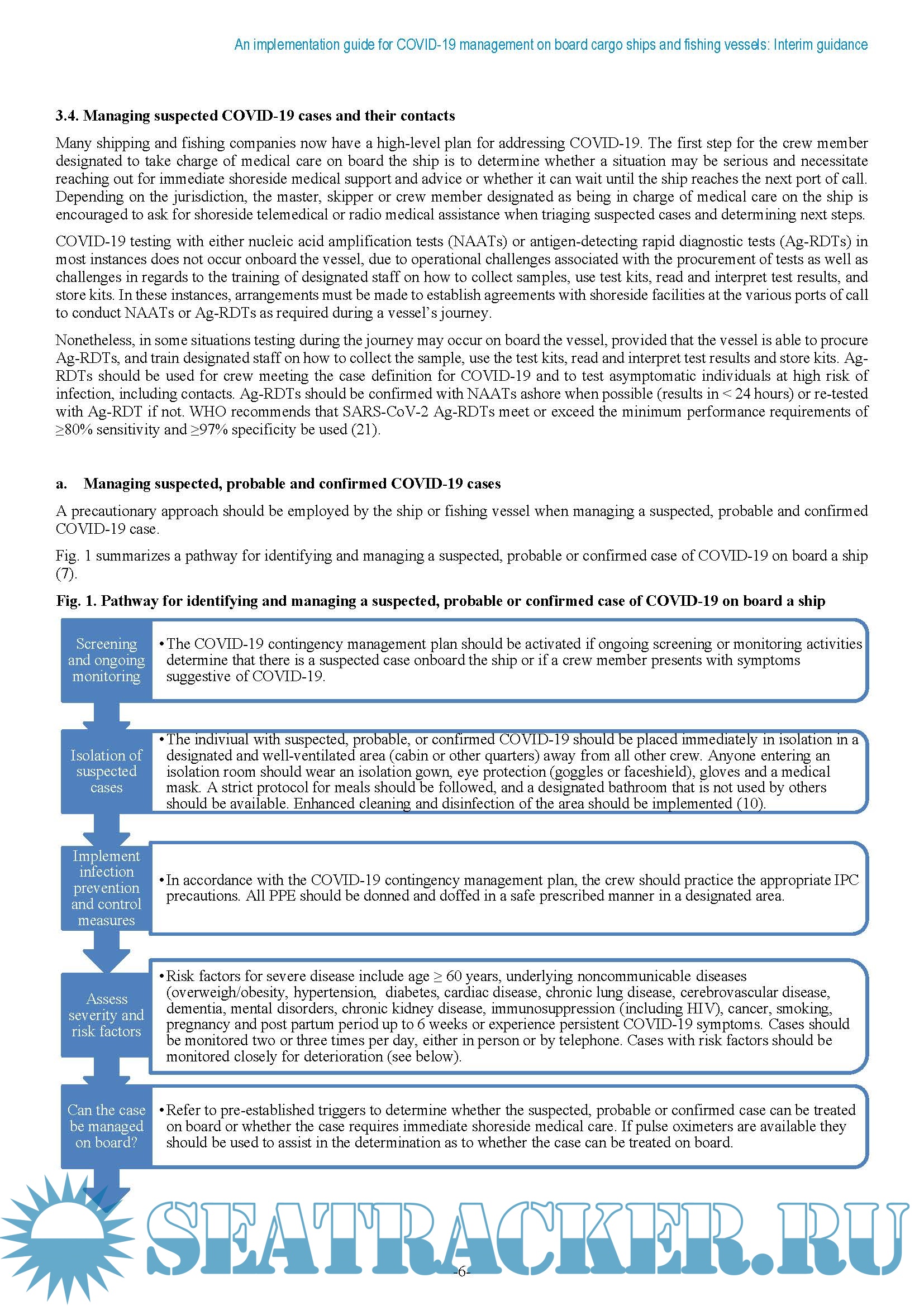 Description: Ship personnel, whether working on ships engaged in cargo transport or fishing, typically work in close contact environments and are therefore susceptible to the transmission of SARS-CoV-2. A COVID-19 outbreak presents special risks for crew and officers making extended voyages without calling at any port and lacking access to shoreside medical facilities. Such an outbreak puts their safety and well-being at risk and may affect their ability to safely navigate and operate the ship (1).
