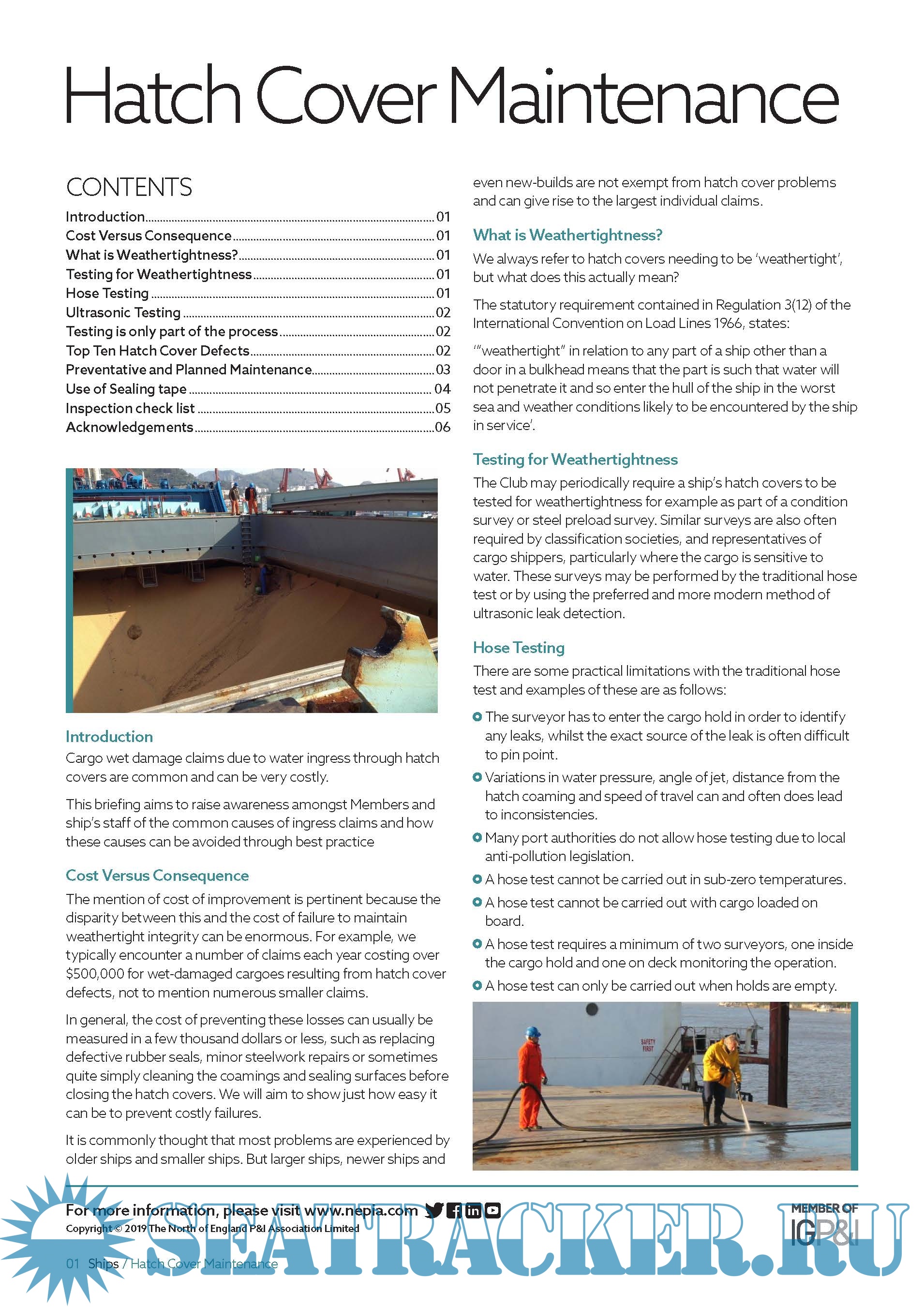 Year: 2019 Language: english Author: the North Genre: Practical guide Format: PDF Quality: eBook Pages count: 12 Description: the First briefing aims "Hatch Cover Maintenance" to raise awareness amongst Members and ship’s staff of the common causes of ingress claims and how these causes can be avoided through best practice. In the Second this briefing aims "Hatch Cover Testing" - Walter Vervloesem of IMCS Group, and training instructor for SDT–IMCS Ultrasonic Hatch Cover Tightness Testing Training course, compares the principal methods of testing hatch cover weathertightness.