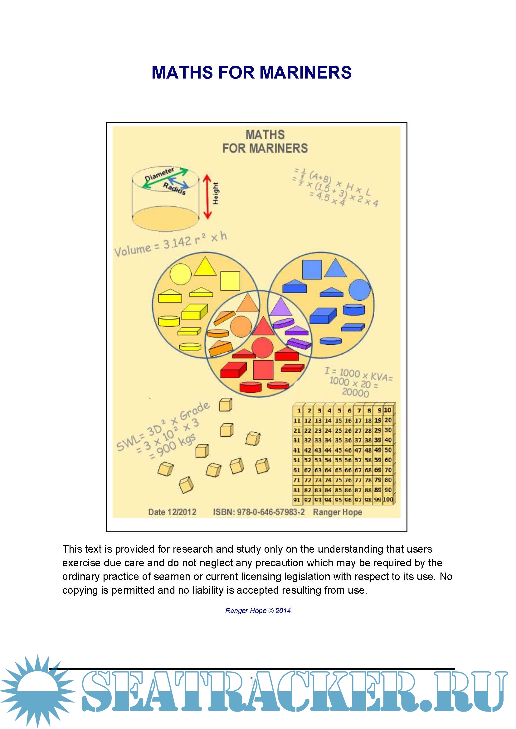 Year: 2014 Language: english Author: Ranger Hope Publisher: Bulmershe Teachers Training Format: PDF Quality: eBook Pages count: 154 Description: This text is intended for those studying to begin a maritime career. It aims to jog the memory of those who may have long since left school or assist others who’s arithmetic, algebra, measure and geometry skills could be bettered. This is a reference for formulas and methods required to solve mathematical problems common in the mariner’s workplace. Although each section begins with basics, it is not intended to be read from start to finish. However, thumbing back to an earlier chapter will often be helpful in refreshing some underpinning concepts.