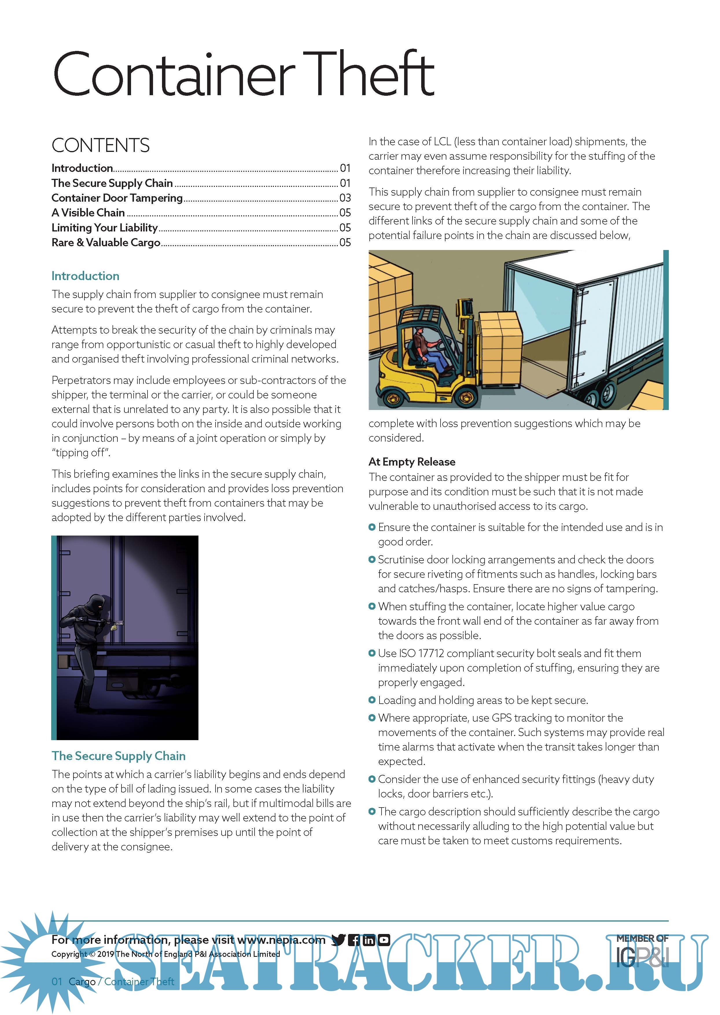 Year: 2021 Language: english Author: the North Genre: Practical guide Format: PDF Quality: eBook Pages count: 7 Description: Attempts to break the security of the chain by criminals may range from opportunistic or casual theft to highly developed and organised theft involving professional criminal networks. Perpetrators may include employees or sub-contractors of the shipper, the terminal or the carrier, or could be someone external that is unrelated to any party. It is also possible that it could involve persons both on the inside and outside working in conjunction – by means of a joint operation or simply by “tipping off”. This briefing examines the links in the secure supply chain, includes points for consideration and provides loss prevention suggestions to prevent theft from containers that may be adopted by the different parties involved.