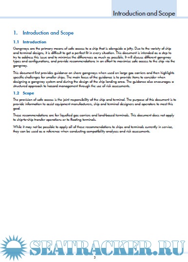 This document first provides guidance on shore gangways when used on large gas carriers and then highlights specific challenges for smaller ships. The main focus of the guidance is to provide items to consider when designing a gangway system and during the design of the ship landing area. The guidance also encourages a structured approach to hazard management through the use of risk assessments.