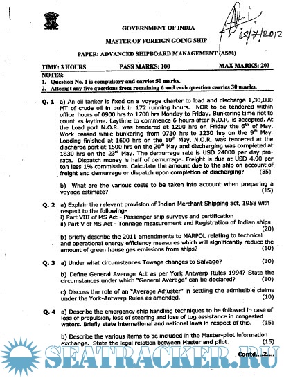 Description: Advanced Shipboard Management (ASM) question paper sets for Mercantile Marine Department (MMD), India examinations.