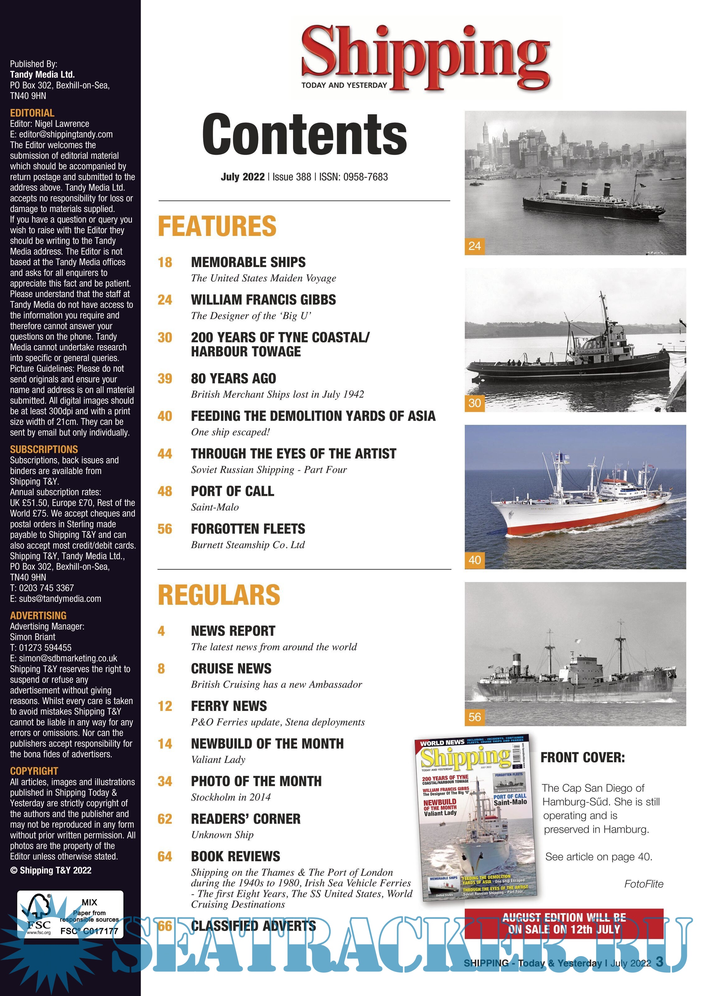 Year: 2022 Language: english Author: Nigel Lawrence (Editor) Genre: Periodical (magazine) Publisher: TANDY Media Format: PDF Quality: eBook Pages count: 68 Description: Shipping Today & Yesterday is a specialist magazine for the shipping enthusiast offering up-to-date information, topical and in-depth historical articles. Shipping Today & Yesterday was first produced in March 1990 by, the then Editor and Publisher, John Young. The first edition stated that it would, “offer a news service covering important developments in the Shipping industry Today and will look back at ships and events of Yesterday, with regular features on merchant ships. ”See "Contents" for details Issue No.388 July, 2022