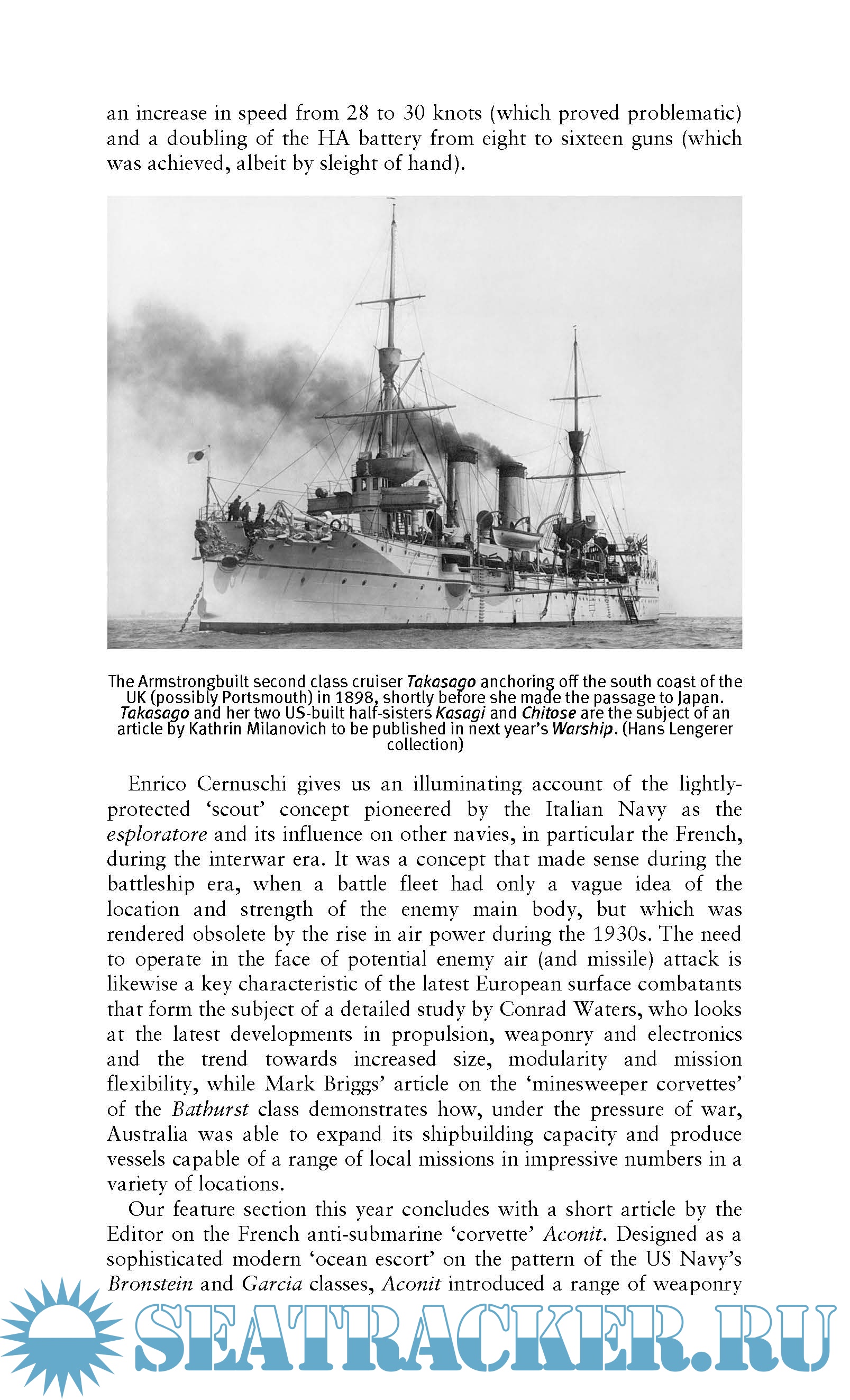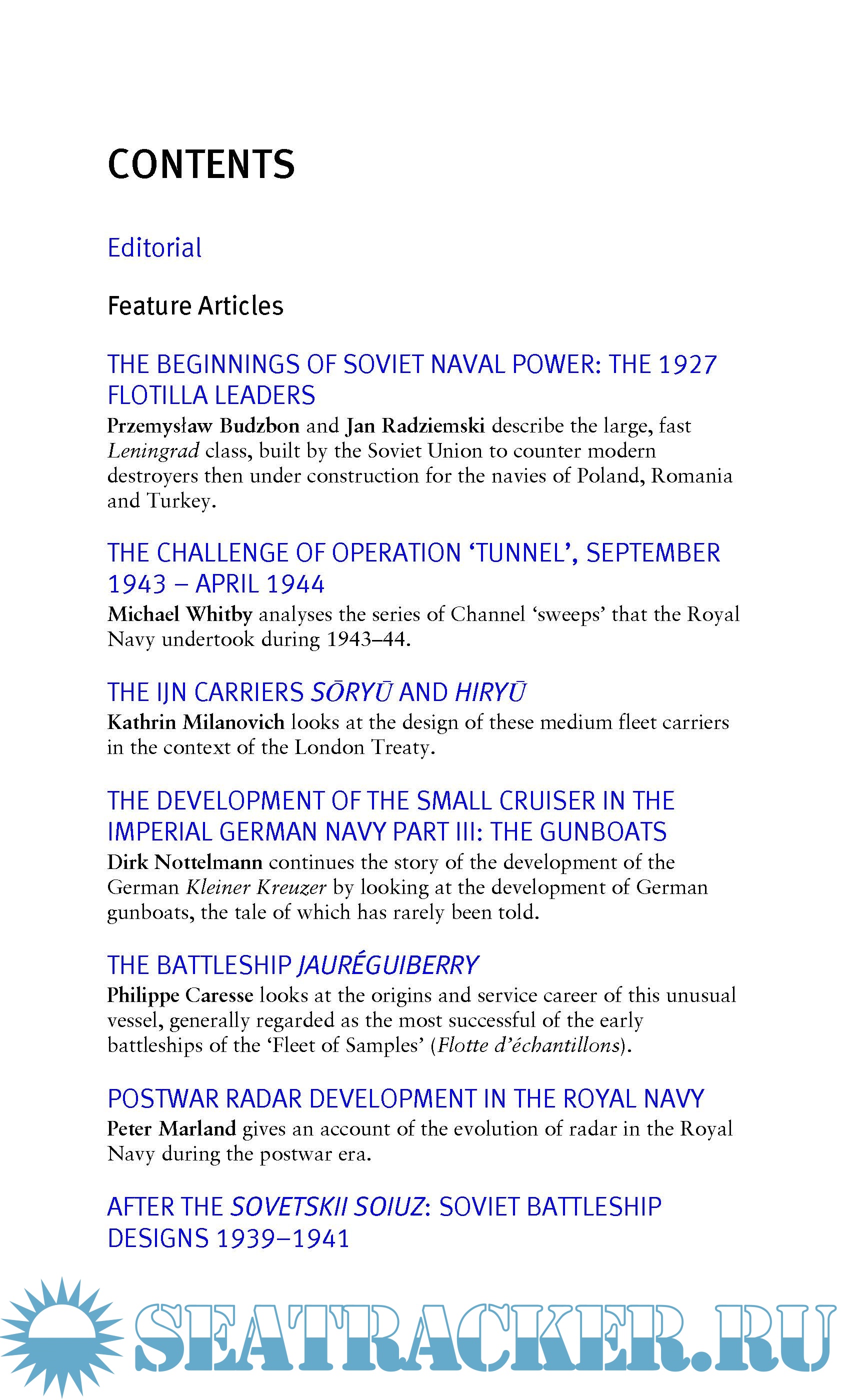 The varied topics in this year's annual includes articles on the Imperial Japanese Navy carriers Soryu and Hiryu, post-war radar development in the Royal Navy, gunboats in the Imperial German Navy, Soviet battleship designs of the early Second World War, modern European frigates, and the origins of the Yokosuka naval yard.